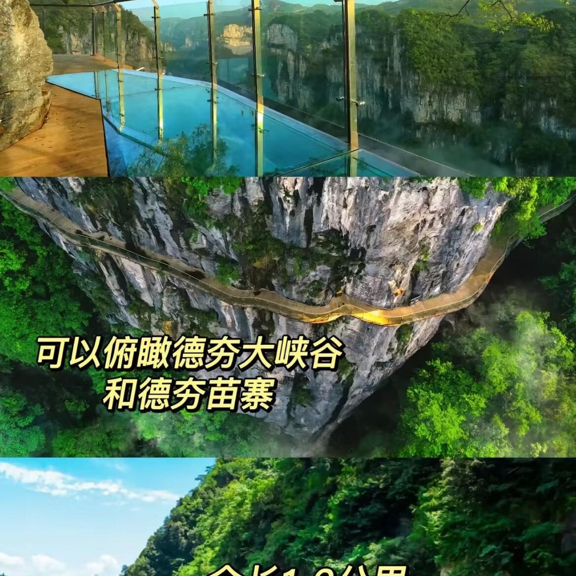 全长1.5公里,垂直落差500米,采用现代设计语言,萃取“蝴蝶”、“飘带”等苗族文化元素,以期形成戏剧性“跌宕起伏”、“惊心动魄”的旗帜性游步道系统。游览悬崖栈道时不仅可以欣赏到山高谷深、崖陡壁俏、林深路幽、巍峨险峻的武陵山脉中最精彩、最险峻、最梦幻的地段,更有天桥(矮寨大桥)、天路(公路奇观)、天台(天问台)交相辉映、互为景致,移步入云,一步一景,构成人文与自然共生,壮丽于精巧同在的峡谷奇观。