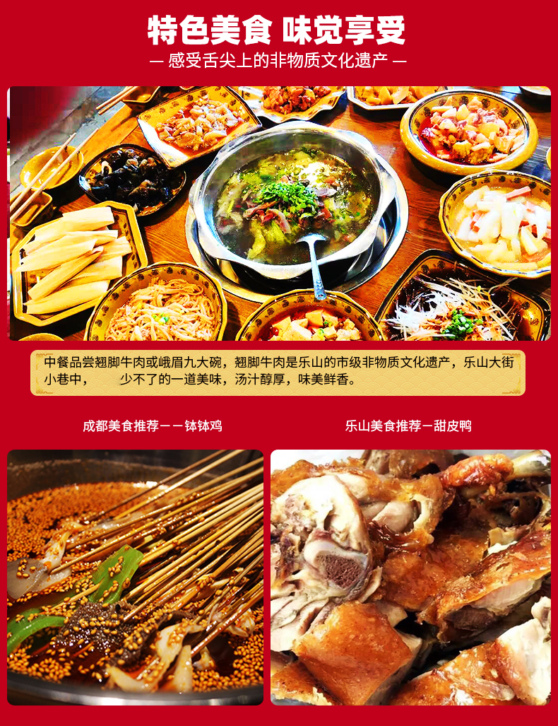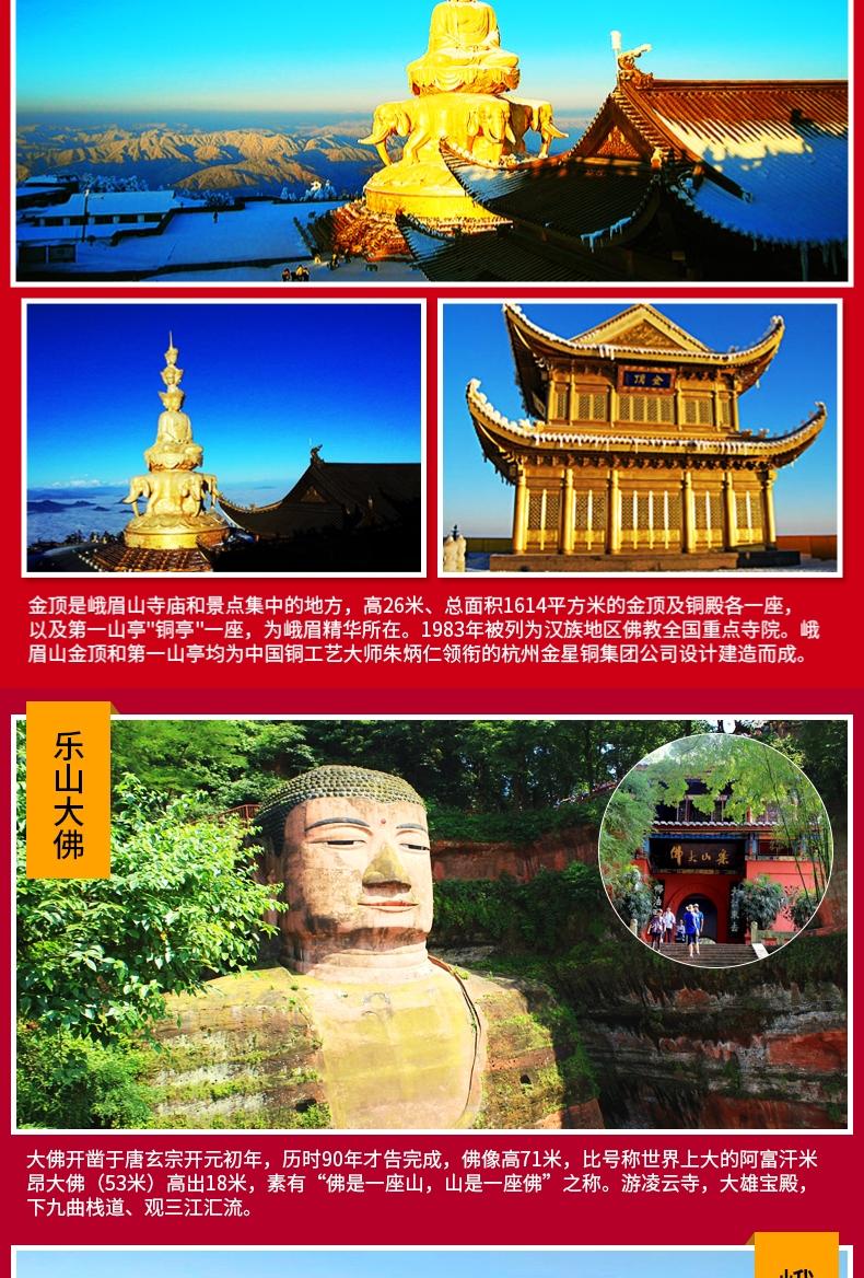 7:00 酒店享用自助早餐后,出发前往峨眉山报国寺(游览50分钟)【峨眉山-报国寺】:峨眉山的第一座寺庙、峨眉山佛教协会所在地,是峨眉山佛教活动的中心。峨眉山的众多寺庙里,报国寺是入山的门户,是游峨眉山的起点。这里寺周楠树蔽空,红墙围绕,伟殿崇宏,金碧生辉,香烟袅袅,磬声频传。后出发游览峨眉山金顶游览(约2小时)【峨眉山-金顶】:乘坐观光车(观光车费用90元/人自理)至雷洞坪,徒步1.5 公里约 40 分钟至接引殿,途经雷洞坪猴区,可以戏峨眉山野生猴群。午餐后乘坐金顶往返索道(费用自理,往返120元/人)上金顶。峨眉金顶是以一尊48米高的十方普贤铜像为中心,由耀日的金殿、雄浑的铜殿、灼灼的银殿和洁白的朝圣大道组成的新金顶。金顶为峨眉山游程的最高峰,其海拔为3077米。在峨眉山金顶,还可能欣赏峨眉的四大奇景:日出、云海、佛光、圣灯。约18:00 在峨眉山市区社会餐厅【峨眉印象】用晚餐晚餐后入住超五星园林温泉酒店【蓝光己庄酒店】——在环境优美中体验来自地下3000米富含多种元素和矿物质的天然温泉。