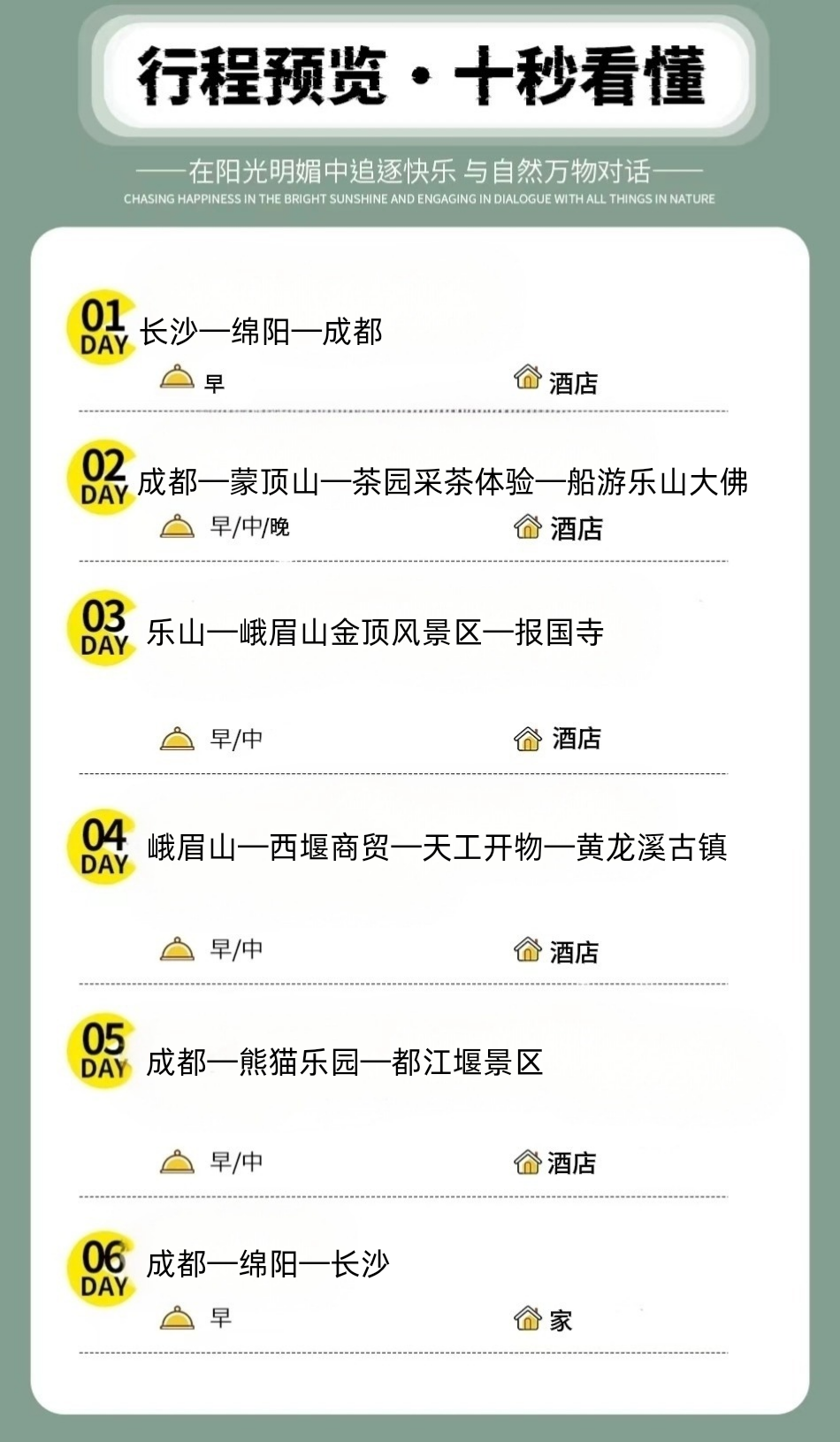 7:00 酒店享用自助早餐后,乘车前往雅安蒙顶山,游览蒙顶山风景区(体验加游览约3小时)【蒙顶山风景区】:国家4A级旅游景区,省级自然与文化遗产;蒙顶山-世界茶文化发源地,世界茶文明的发祥地,茶马古道的起点,生态环境得天独厚普的蒙顶山被誉为“仙茶故乡”。【茶园采茶体验】:在工作人员的带领下,拎上竹篮,到茶园里体验采茶活动,当一回采茶仙子,观炒茶师傅手工制作茶叶,也可自己体验制茶的乐趣。乘索道(自费往返30元/人)至天盖寺,游览天盖寺、千年银杏群、茶神殿、茶文化碑廊、千年茶树王、阴阳麒麟石、甘露泉、皇茶园,而后沿山游道返回天盖寺品贡茶、观非物质文化遗产【龙行十八式茶艺表演】。(体验和观功夫茶艺表演时间40分钟)13:00 前往酒楼,品尝雅安三绝之一的雅鱼养生宴午餐后前往乐山游览,【船游乐山大佛】:又名凌云大佛。乐山大佛素有“山是一尊佛·参拜,庄严雄伟,佛是一座山·仰视,气势崴嵬”之称。游江船上正面观坐佛容貌,远观凌云山佛是一座山 山是一尊佛的奇妙意境。游览结束返回酒店休息。享用晚餐后返回酒店休息。