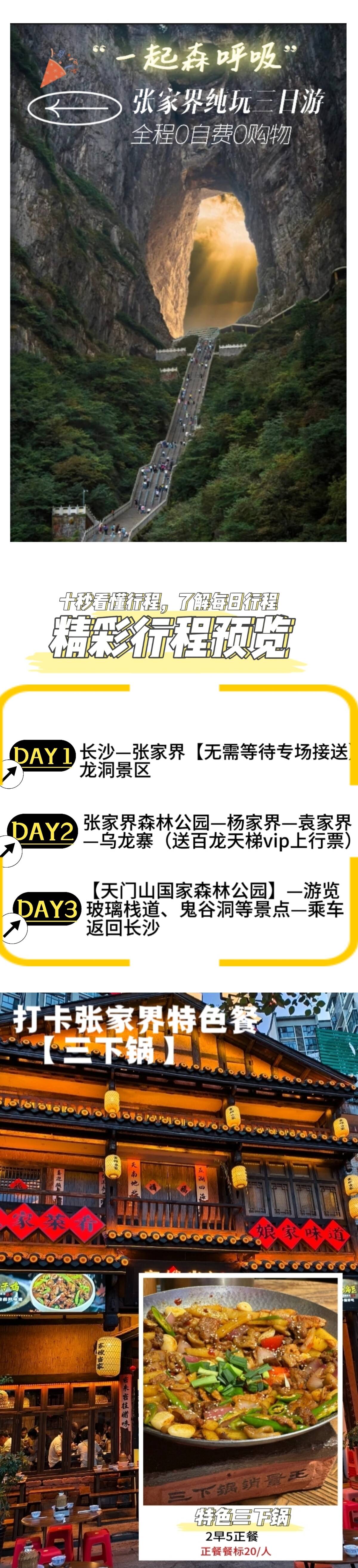 登999级天梯或乘扶梯至世界最高天然穿山溶洞“天门洞”体验自然造化的神奇和震撼。下午乘车返回长沙,行程结束。