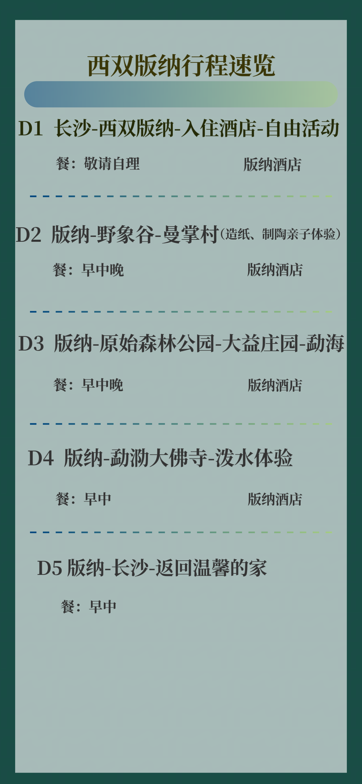 1、交通:长沙—版纳往返经济舱,含机场建设及燃油费;当地空调旅游大巴