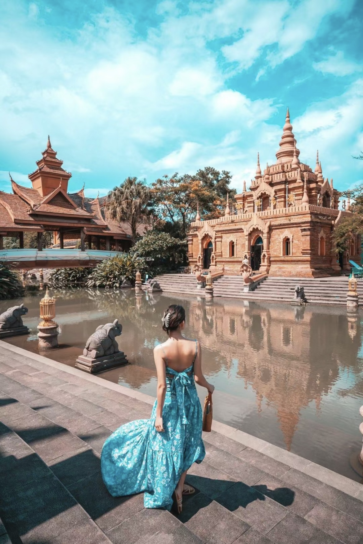 从万佛塔前广场俯视景洪市区,旖旎的热带风光尽收眼底,可体验最具傣族传统特色的泼水体验活动,不在泼水节,一样湿身狂欢,尽情释放,佛光普照之下,为您带来更多的祝福。