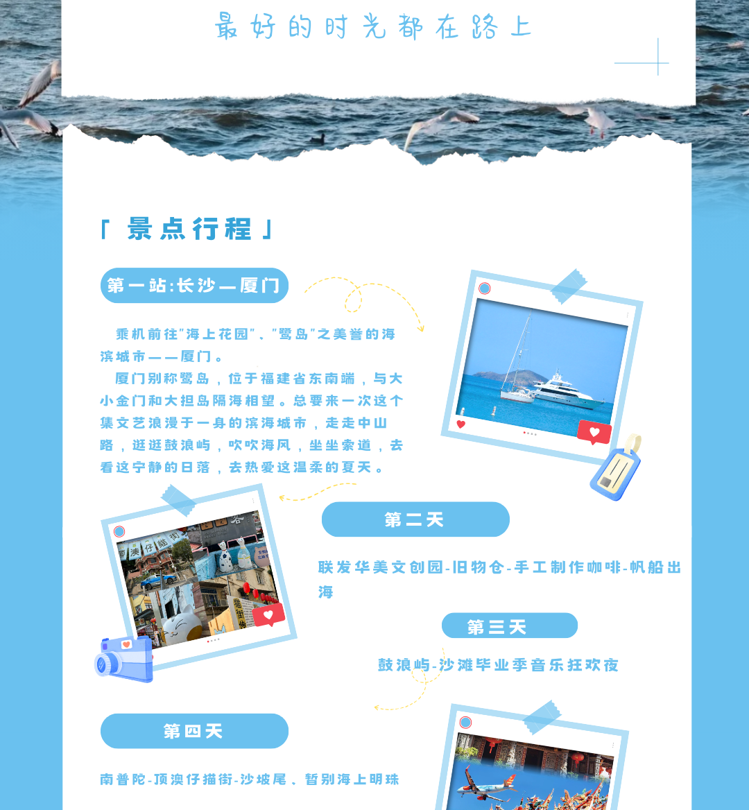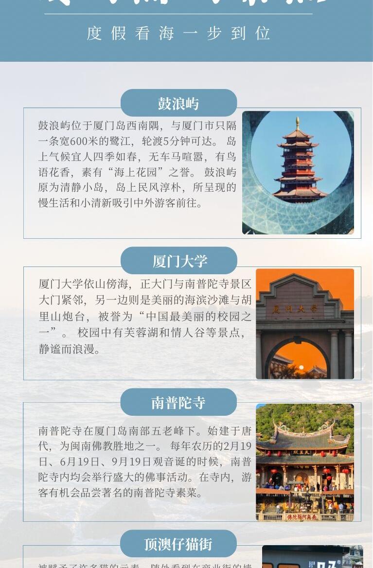 【优选行程】进行手工咖啡制作体验,体验帆船出海,游览鼓浪屿,开启沙滩毕业季音乐狂欢夜。 【尊享入住】为您精选了厦门海景酒店,坐拥一-线海景,享受悠闲假期。 【精品团】赠帆船出海体验,和大海来一次亲密接触 鼓浪屿来去渡轮往返,赠往返船票 鼓浪屿一日游:送资深导游带团,畅游世遗小岛