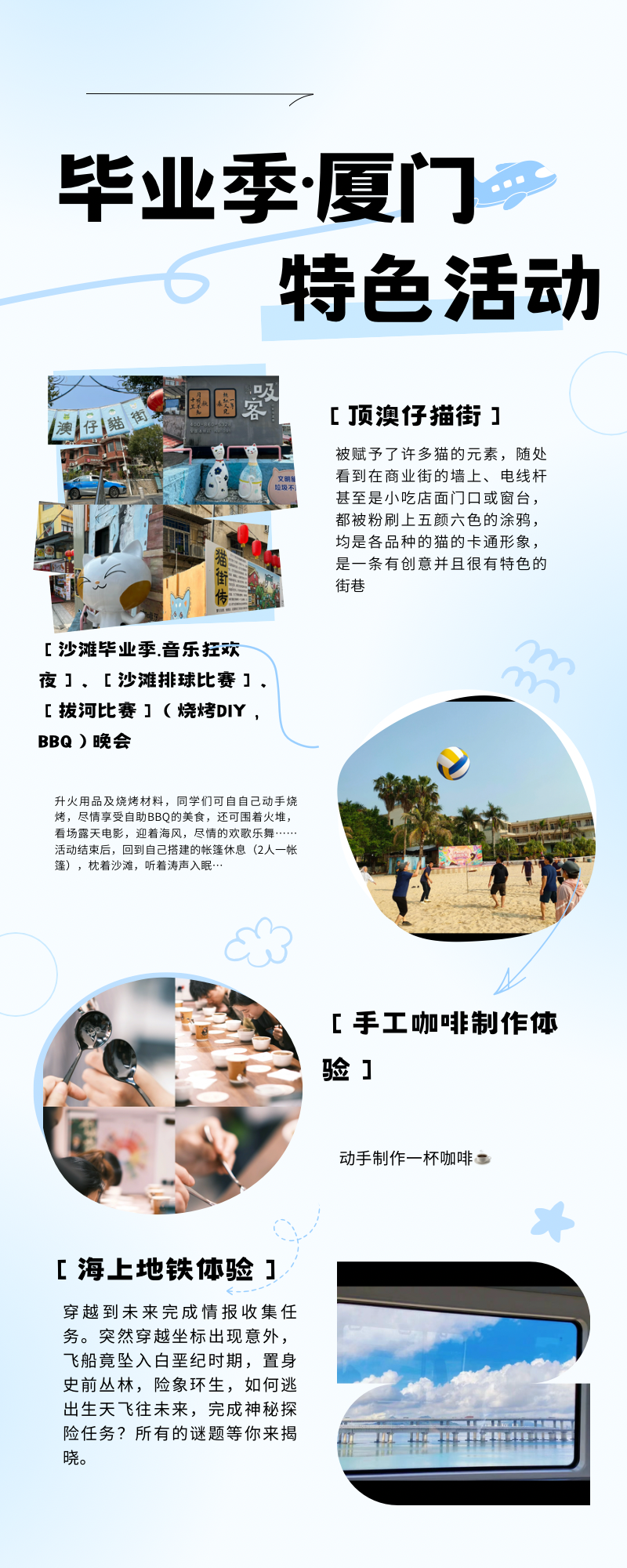 下午约定时间返回厦门市区,后安排【沙滩毕业季.音乐狂欢夜】:抵达前往【帐篷基地】搭建属于你的“家”,每组合伙人要【亲手搭帐篷】,要想有地方睡要和伙伴合伙搭建属于你们自己的“小窝”为你们遮风挡雨,其中的酸甜苦辣只有自己知道(如果有不会搭建的可以询问帐篷的主人或者其他会搭建的伙伴)海边趣味【沙滩排球比赛】在沙滩上进行【拔河比赛】(烧烤DIY,BBQ)晚会,导游为大家准备了升火用品及烧烤材料,同学们可自自己动手烧烤,尽情享受自助BBQ的美食,还可围着火堆,看场露天电影,迎着海风,尽情的欢歌乐舞……活动结束后,回到自己搭建的帐篷休息(2人一帐篷),枕着沙滩,听着涛声入眠…