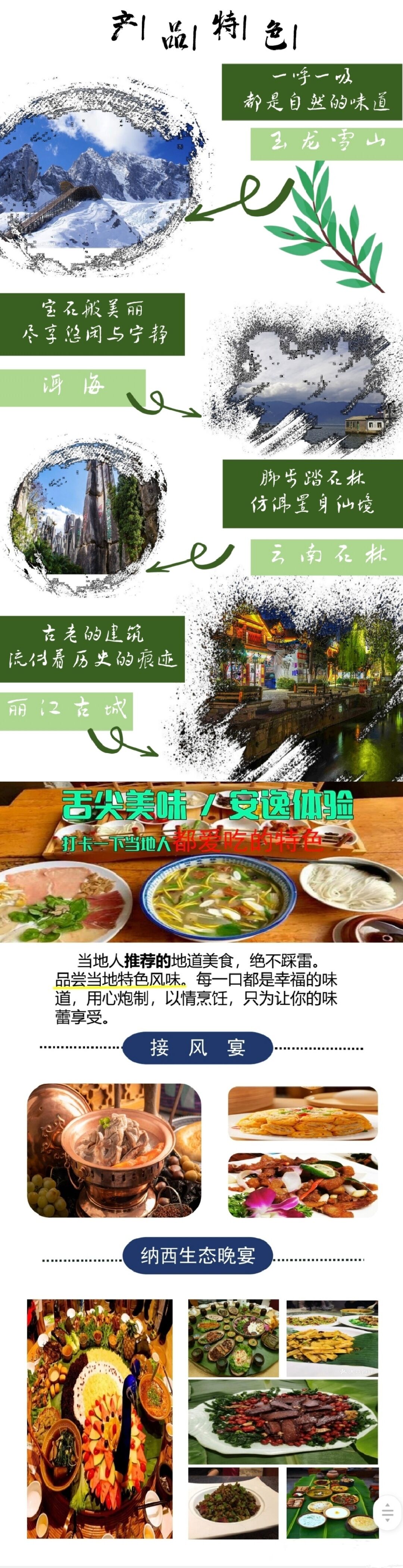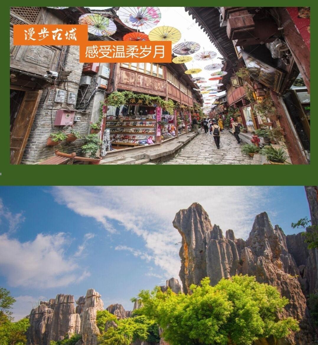 【石林风景名胜区】石林是世界典型的喀斯特地貌景观;【接风宴】感受彝族人民的热情;【洱海】,洱海是白族人民的“母亲湖”,白族先民称之为“金月亮”,是一个风光秀媚的高原淡水湖泊;【水花庄园】,品尝田园BBQ,园内四季鲜花盛开,在繁花萦绕中,体验传说中炭火烤制、地道的云南腌制食材,美味清凉的饮品……多样的云南风味烧烤;游览具有“东方瑞士“之称的【玉龙雪山风景区】;【丽江古城】在世界文化遗产中寻味纳西民族的纯朴和文化寻味小桥流水的闲适与浪漫。