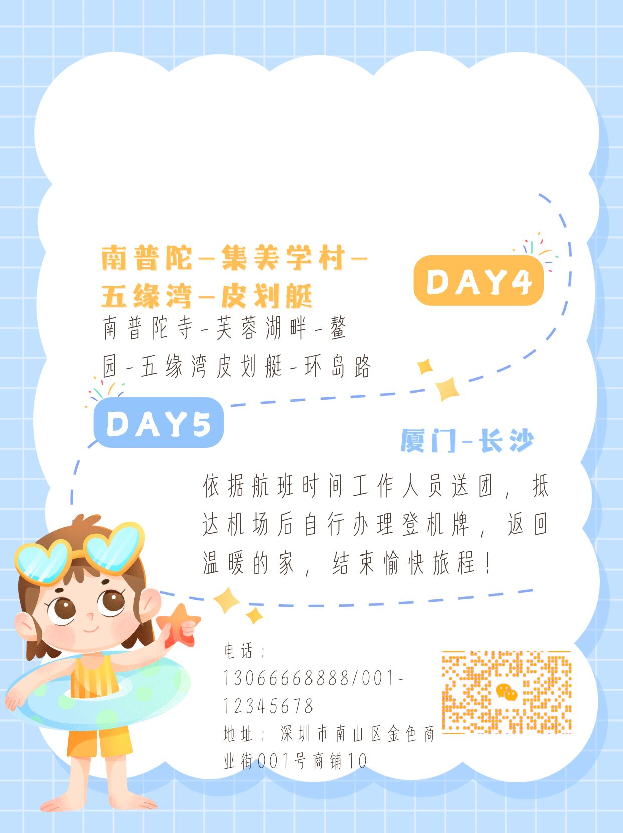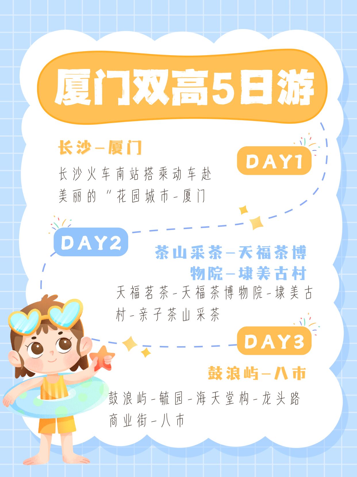 1、交通:长沙—厦门高铁二等座,当地空调旅游大巴,儿童报价不含高铁票;