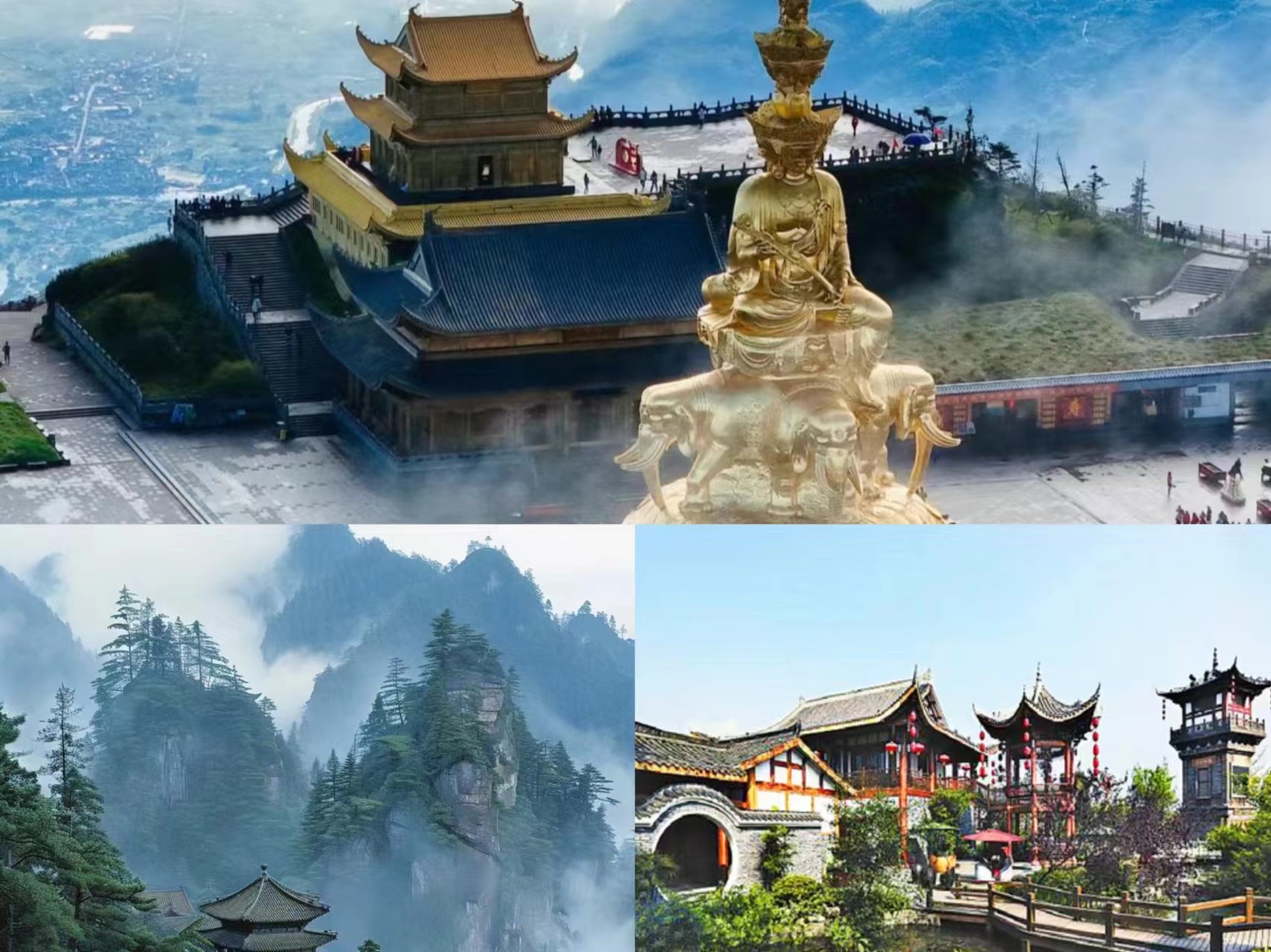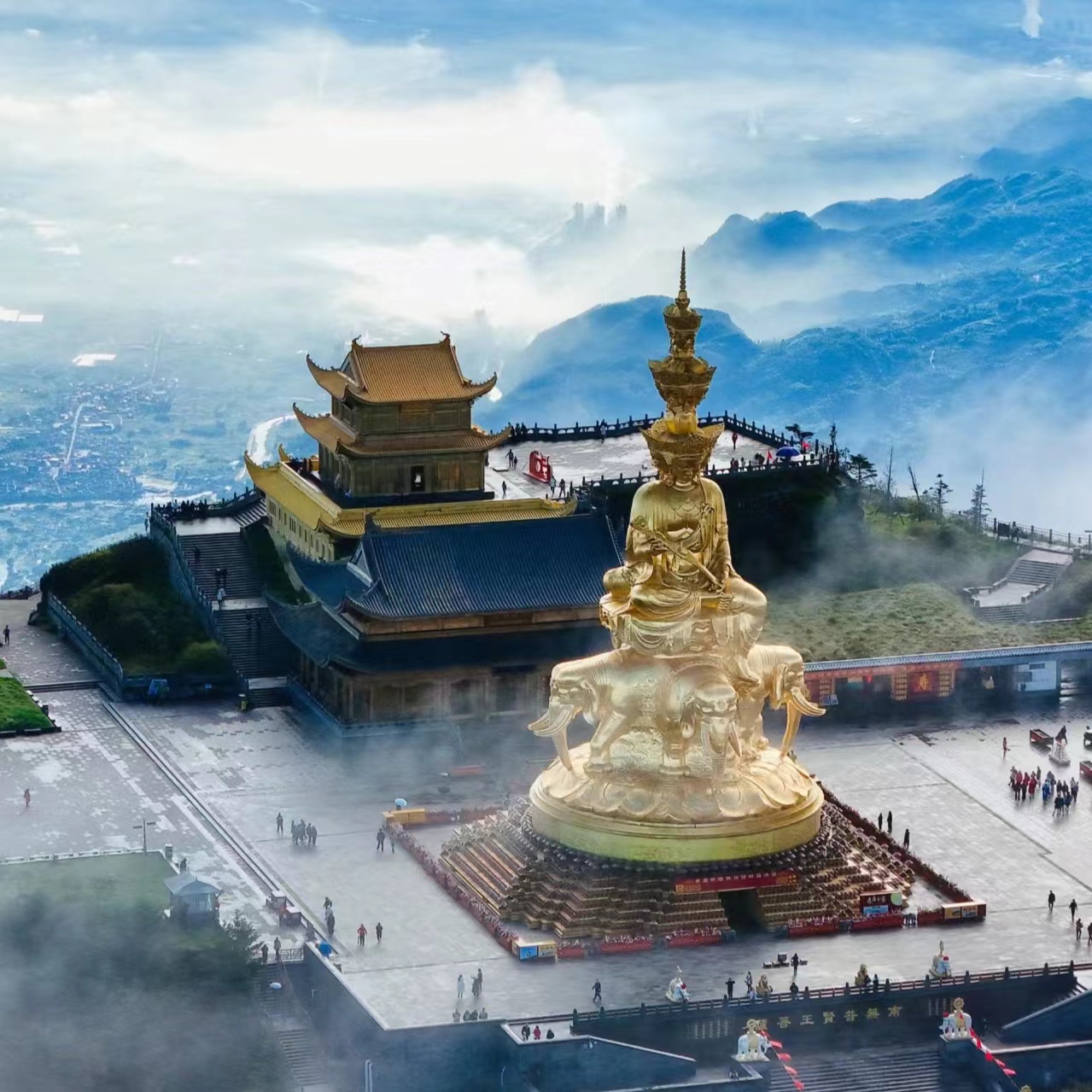 早餐后,前往峨眉山。【峨眉山-金顶】乘坐观光车(费用90元自理,上行索道80/下行索道40需自理)至雷洞坪,徒步至接引殿。峨眉金顶是以一尊48米高的十方普贤铜像为中心,由耀日的金殿、雄浑的铜殿、灼灼的银殿和洁白的朝圣大道组成的新金顶。金顶为峨眉山游程的最高峰,其海拔为3077米。顶上是个小平原,原有铜殿一座,在太阳的照射下,光彩夺目,故而得名金顶。登上金顶,人们顿觉万象排空,气势磅礴,惊叹天地之奇妙。在峨眉山金顶,还可能欣赏峨眉的四大奇景:日出、云海、佛光、圣灯。