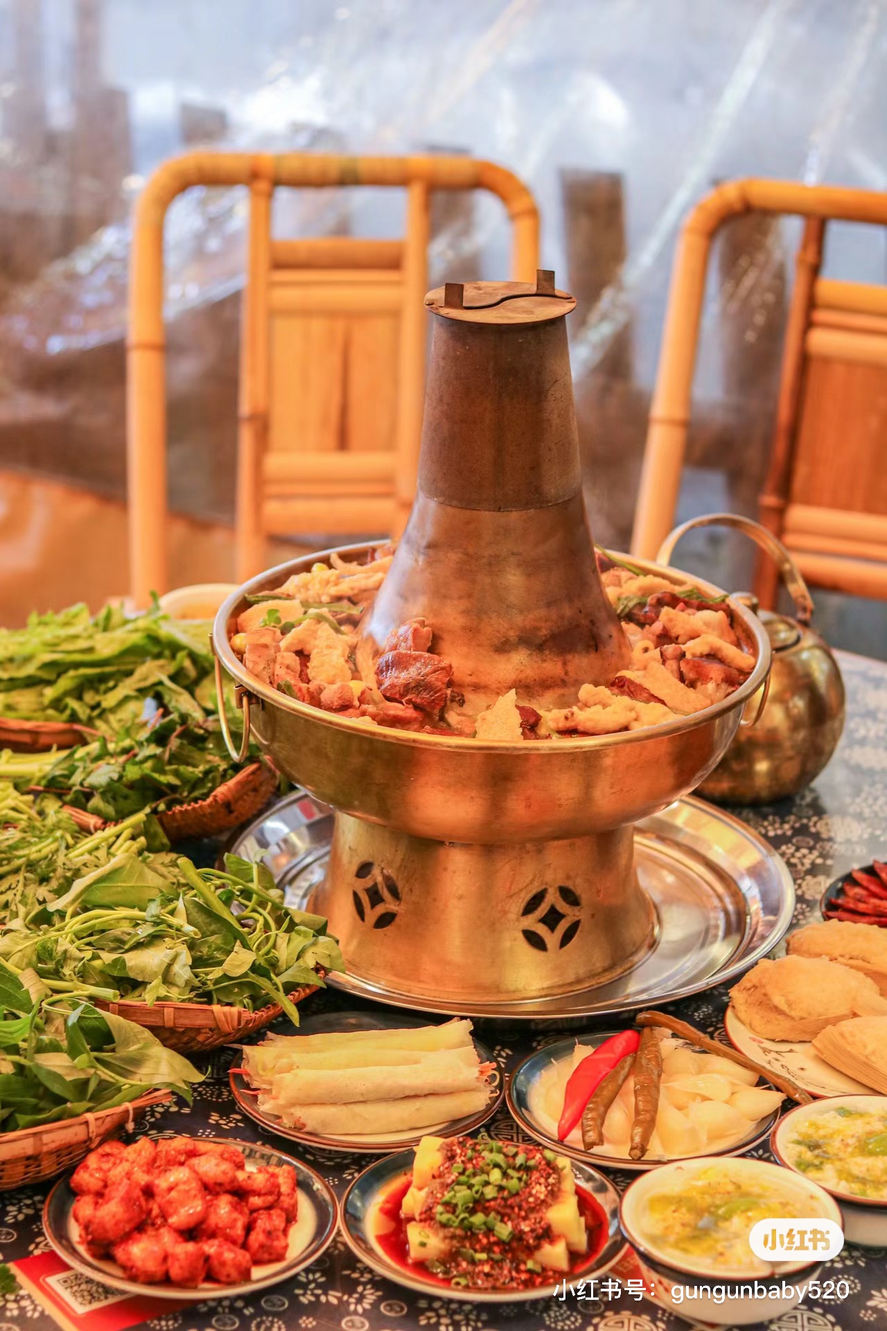 晚餐享用:生态野菜铜火锅。每天外地新鲜运输的野菜,搭配铜锅,高汤用腊排骨、腊猪蹄、鸡以及各种豆子一起熬出来,鲜香可口。