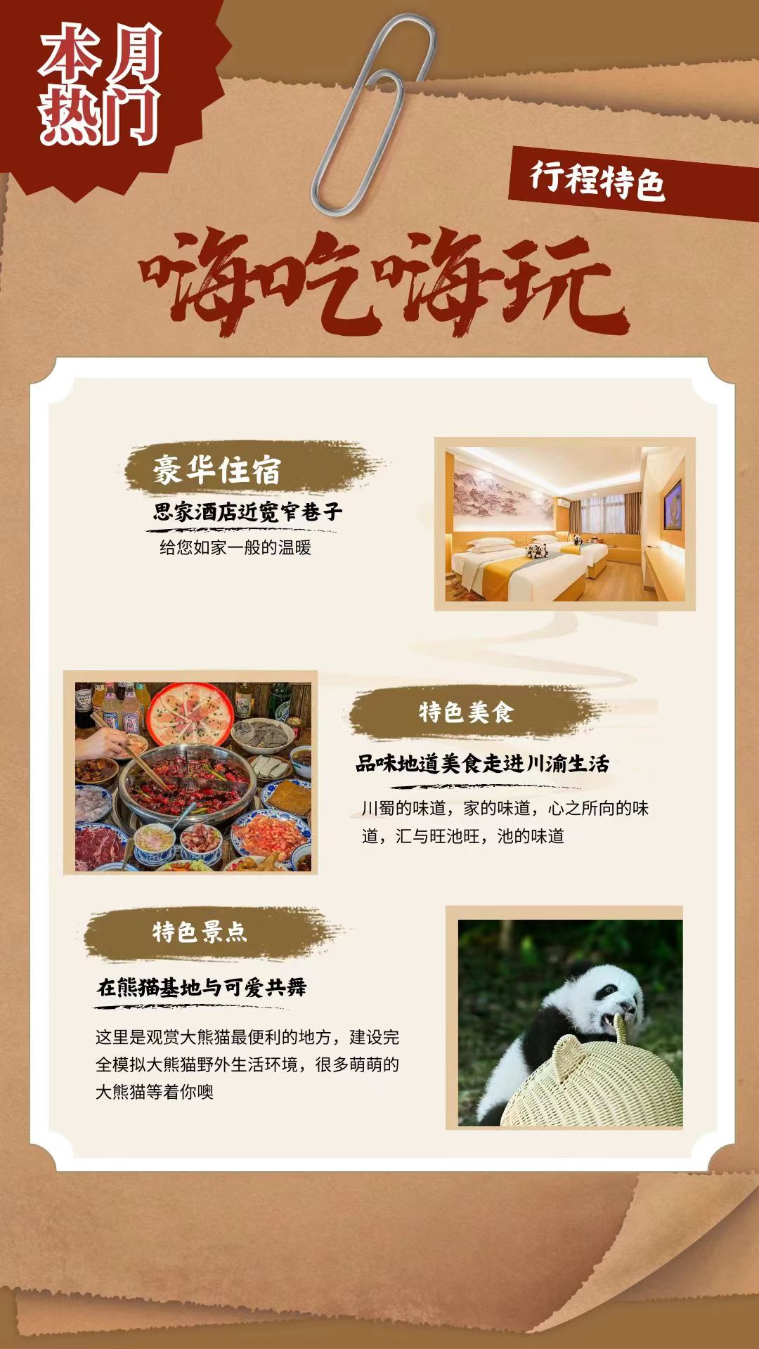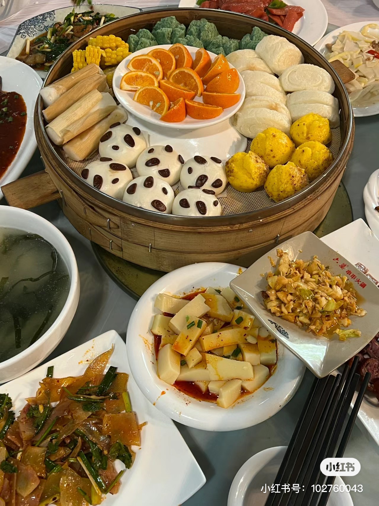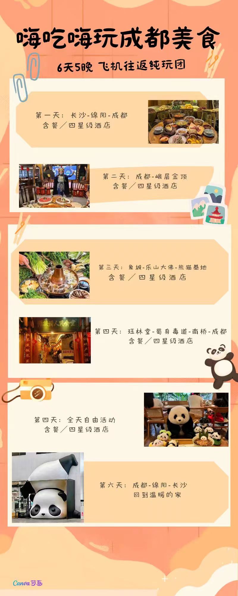 晚餐享用【熊猫主题小吃宴】:专属定制,精挑细选每一道本土小吃,吃的就是经典!凉菜:伤心凉粉、口味凉面,泡菜什锦;热菜:火锅冒菜,鸡汤耙耙菜,滋补银耳汤