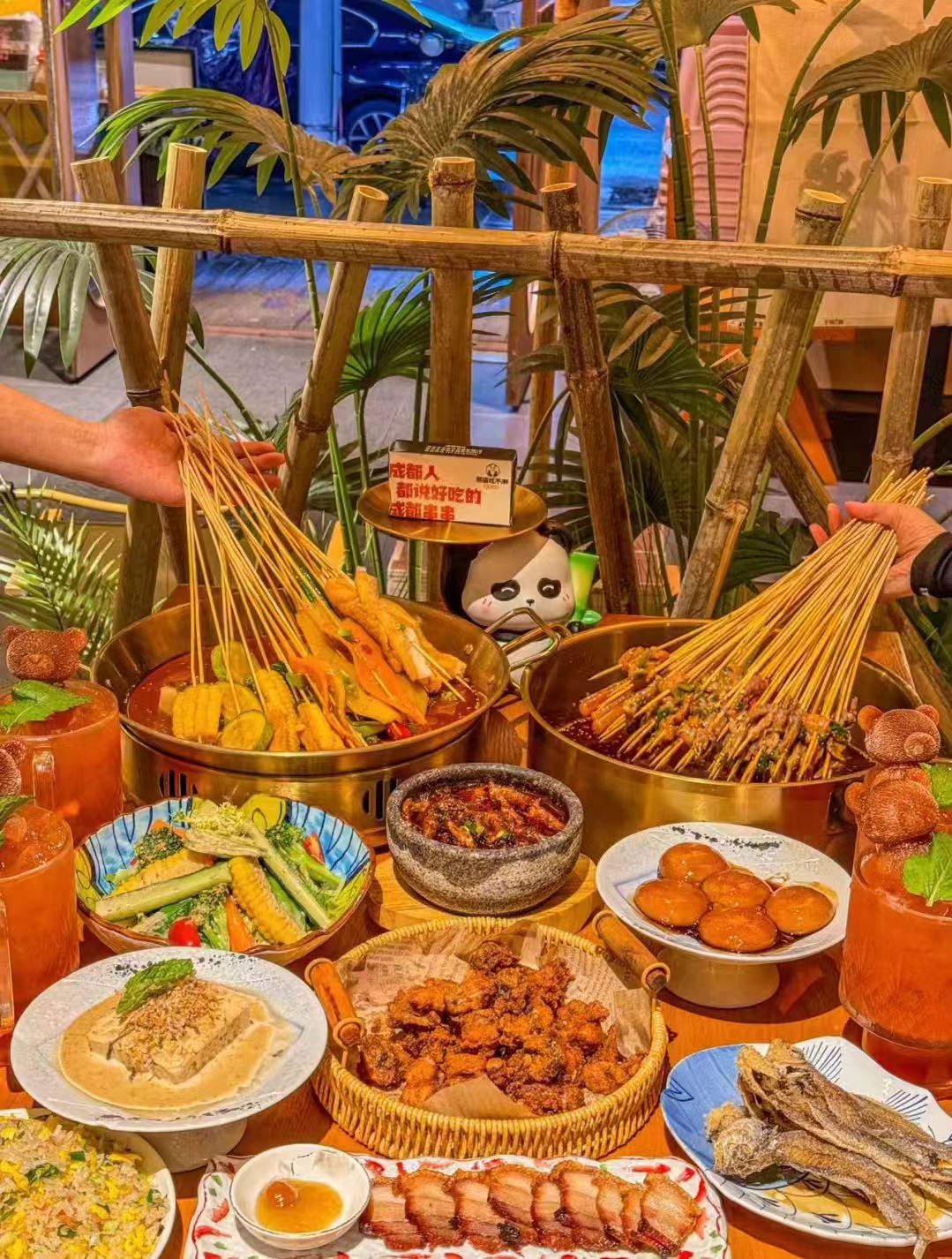 晚餐享用【熊猫主题小吃宴】:专属定制,精挑细选每一道本土小吃,吃的就是经典!凉菜:伤心凉粉、口味凉面,泡菜什锦;热菜:火锅冒菜,鸡汤耙耙菜,滋补银耳汤