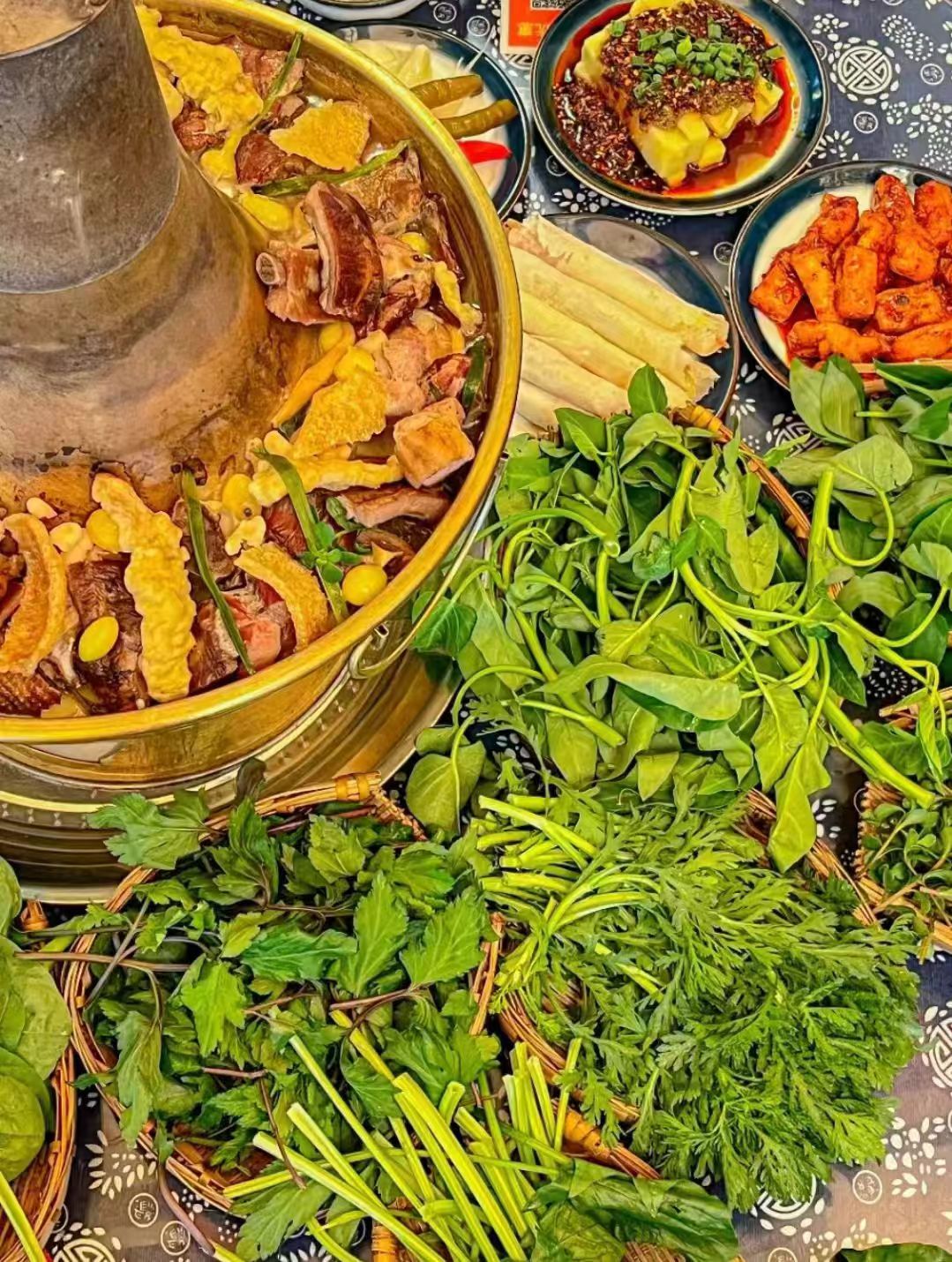 晚餐享用:生态野菜铜火锅。每天外地新鲜运输的野菜,搭配铜锅,高汤用腊排骨、腊猪蹄、鸡以及各种豆子一起熬出来,鲜香可口。