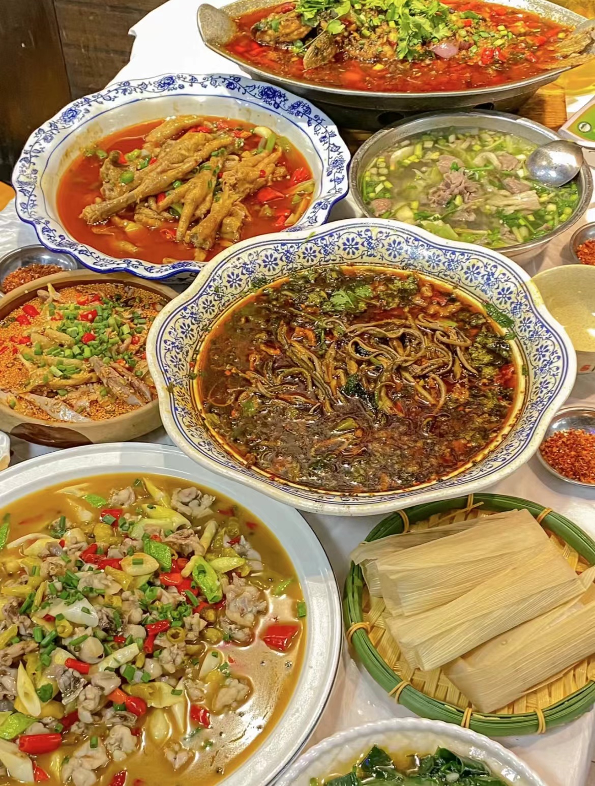 太安豆瓣鱼,东坡肘子,野生菌烧肉,峨眉老腊肉,香切白斩鸡,农家香碗,野菜煎蛋饼,冰汁南瓜,炒野菜,时令蔬菜,天麻雪花笋炖鸡汤。