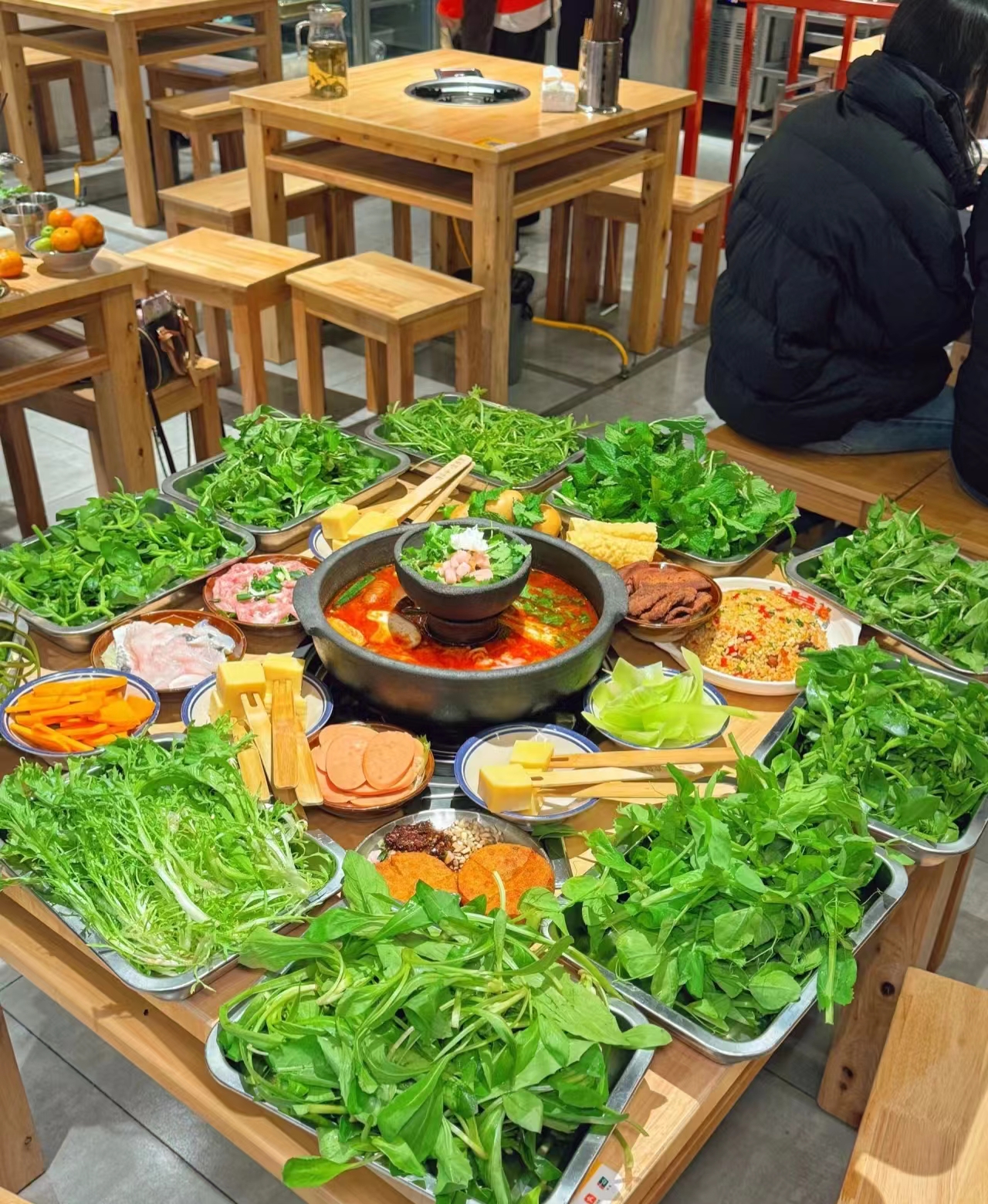 晚餐享用:生态野菜铜火锅。每天外地新鲜运输的野菜,搭配铜锅,高汤用腊排骨、腊猪蹄、鸡以及各种豆子一起熬出来,鲜香可口。