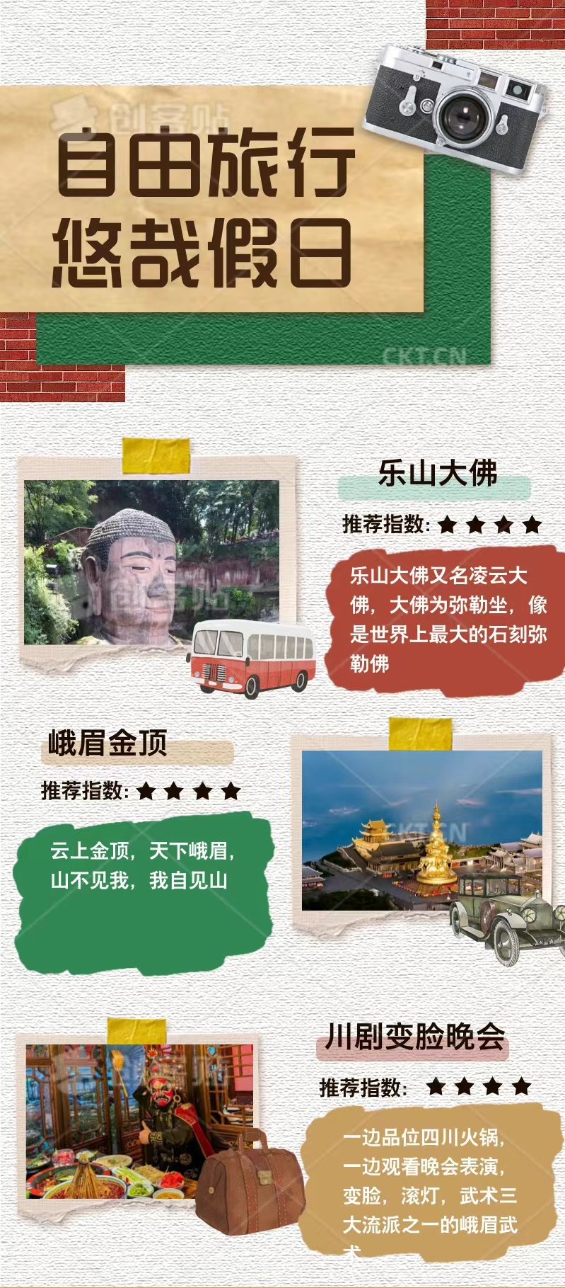 早餐后前往风情古街【象城禅意小镇】(具体游览,导游根据时间来安排),这里传承了川西仿古建筑风格,融入了当地的文化风情。是峨眉山市颇具特色的民俗文化旅游街。【游船乐山】:告别超3小时排队,拒绝往返25层楼高徒步,这才是欣赏大佛更好的角度!乘船观看大佛全貌,更好的感受大佛威严壮观,并诚心为自己,为家人,为朋友祈福!