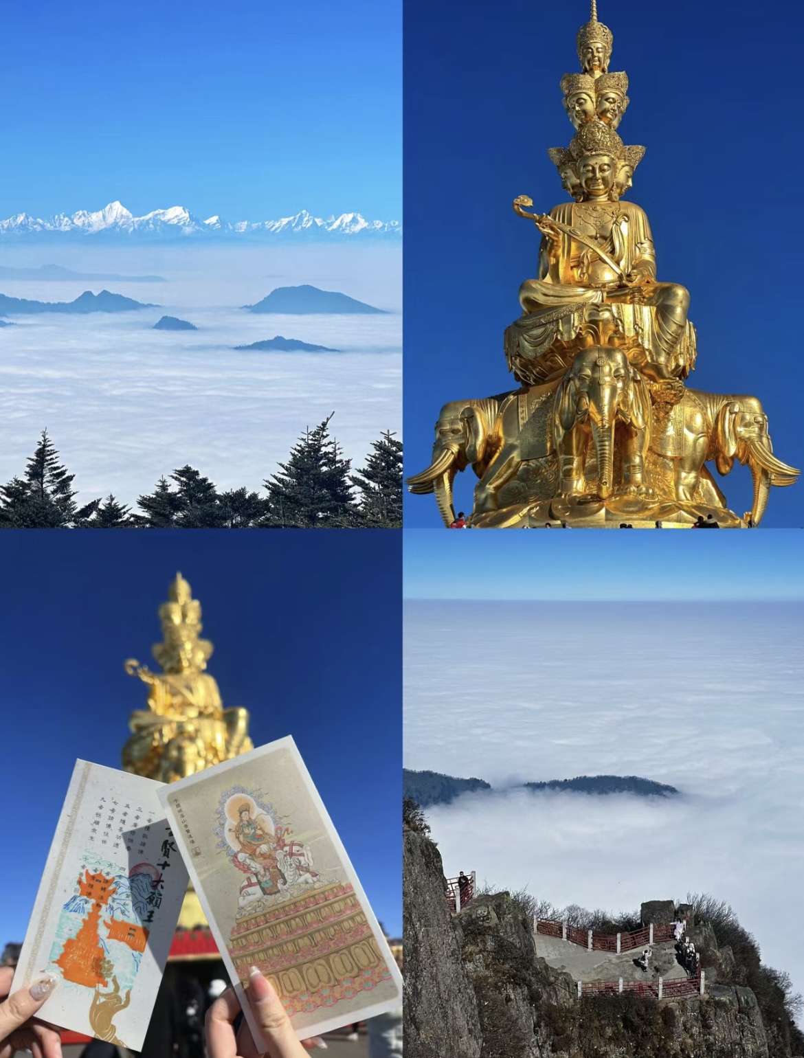 早餐后,前往峨眉山。【峨眉山-金顶】乘坐观光车(费用90元自理,上行索道80/下行索道40需自理)至雷洞坪,徒步至接引殿。峨眉金顶是以一尊48米高的十方普贤铜像为中心,由耀日的金殿、雄浑的铜殿、灼灼的银殿和洁白的朝圣大道组成的新金顶。金顶为峨眉山游程的最高峰,其海拔为3077米。顶上是个小平原,原有铜殿一座,在太阳的照射下,光彩夺目,故而得名金顶。登上金顶,人们顿觉万象排空,气势磅礴,惊叹天地之奇妙。在峨眉山金顶,还可能欣赏峨眉的四大奇景:日出、云海、佛光、圣灯。