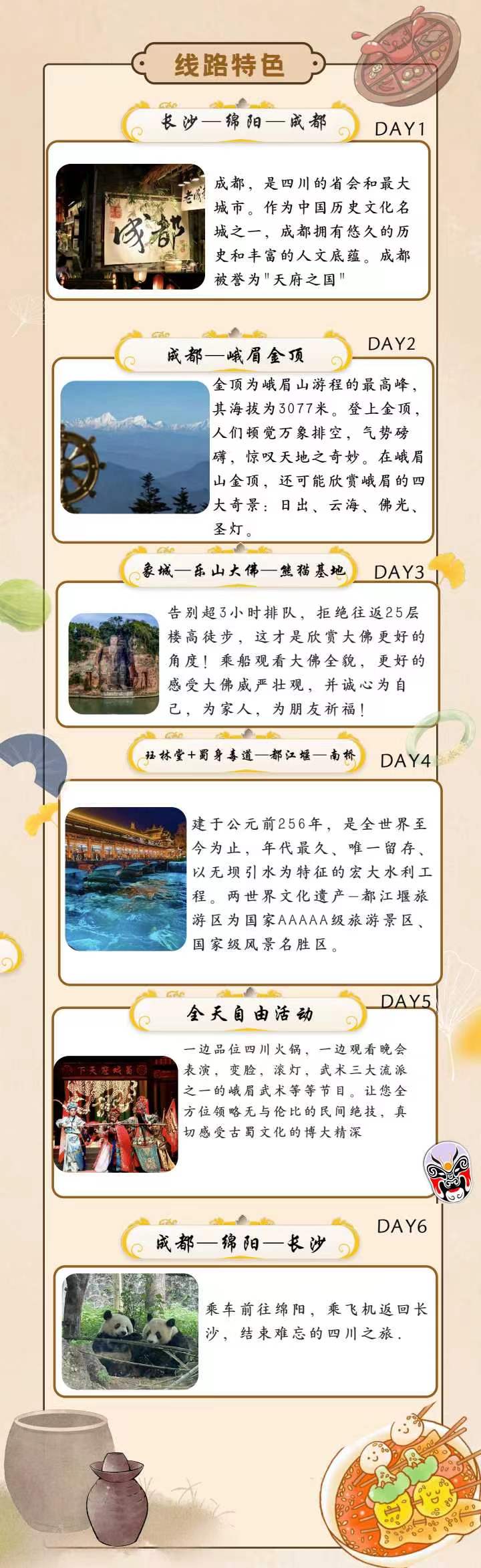 欣赏峨眉山金顶的四大奇景:日出、云海、佛光、圣灯,观看晚会表演, 变脸,滚灯,武术三大流派之一的峨眉武术等节目 乘船观看大佛全貌,游览象城禅意小镇,游览熊猫基地,游览珏琳堂翡翠和蜀身毒道以及都江堰,享用师徒情主题人民食堂,成都最火爆、最有情怀的红色怀旧的记忆餐厅。