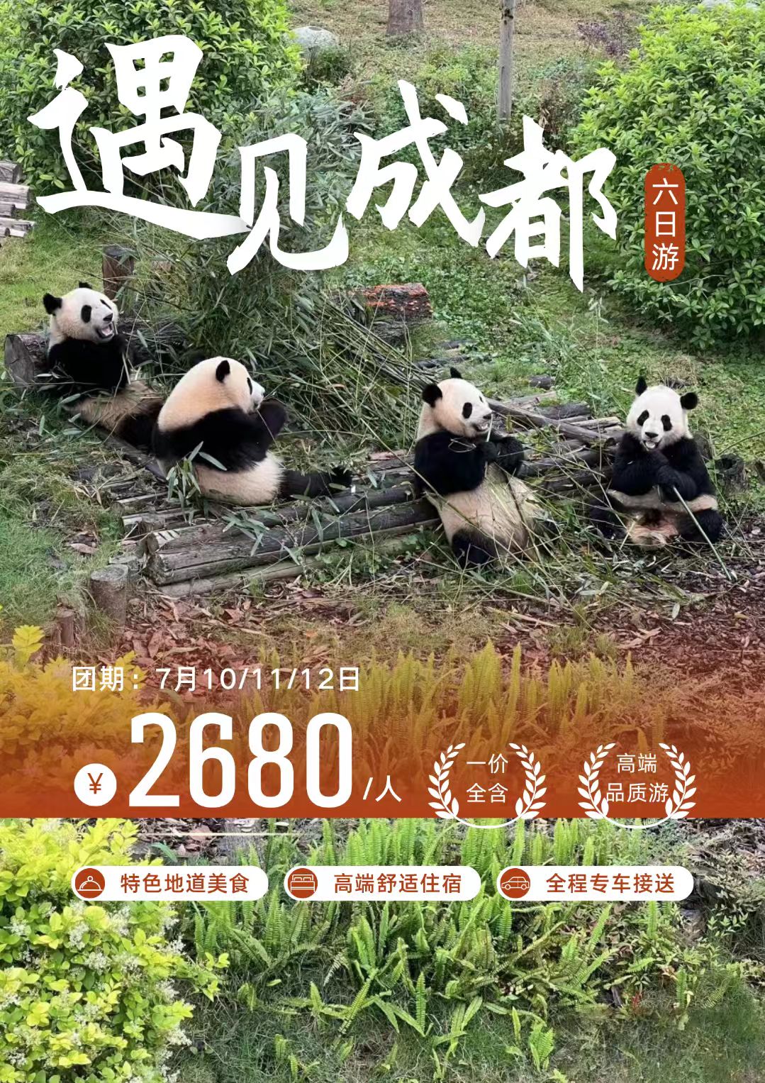 下午游览【熊猫基地】这里是成都周边观赏大熊猫最便利的地方,很多萌萌的大熊猫等着你哦,建设完全模拟大熊猫野外生活环境,建有湖泊、溪流、竹林、草坪等,你可以近距离的去观赏这些萌哒哒的国宝们。
