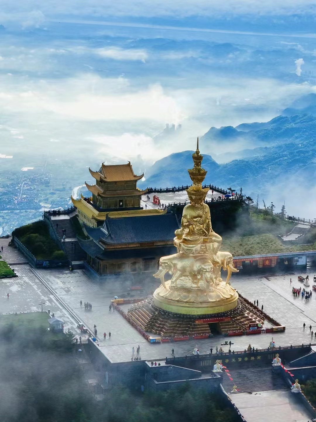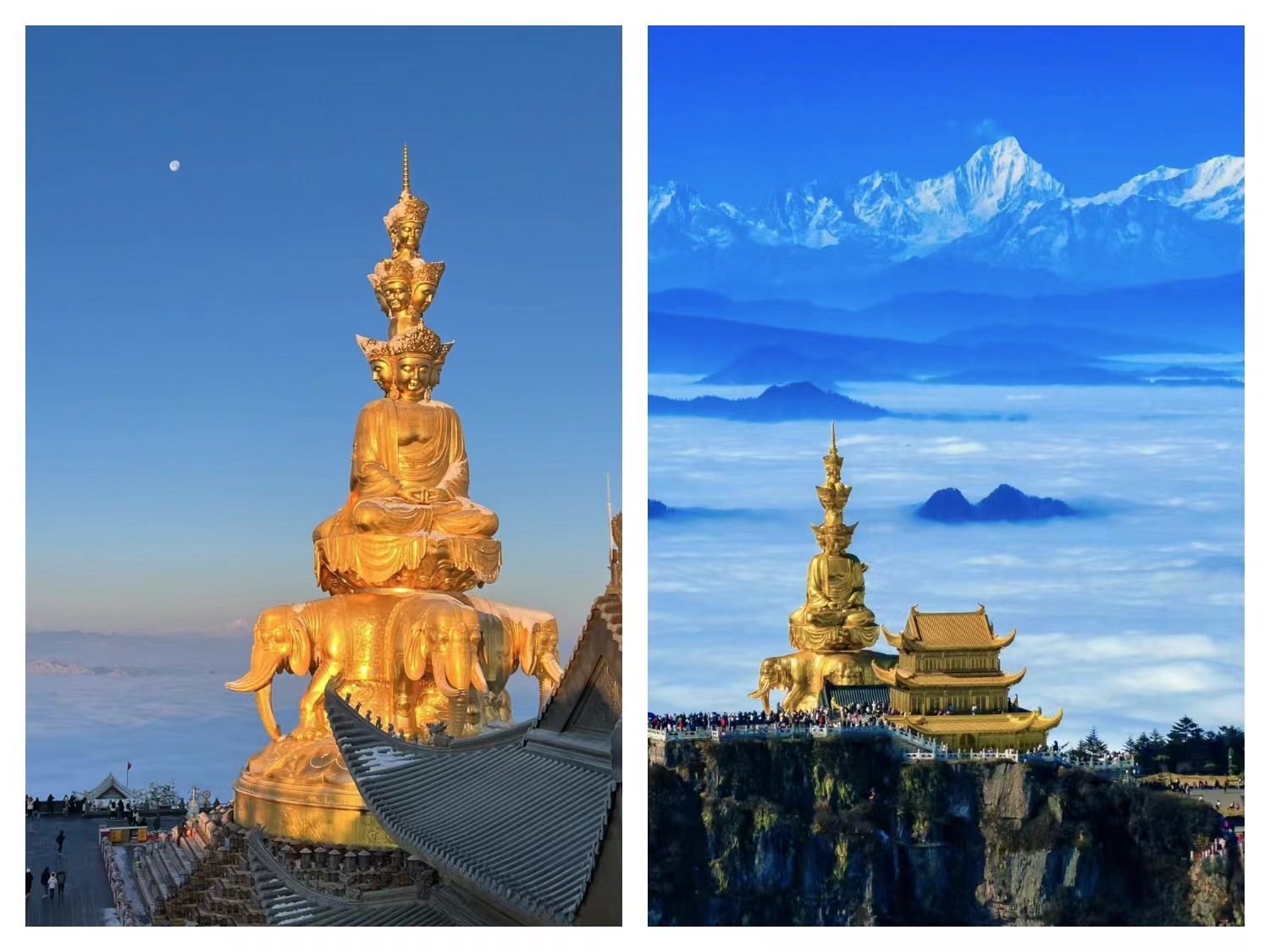 早餐后,前往峨眉山。【峨眉山-金顶】乘坐观光车(费用90元自理,上行索道80/下行索道40需自理)至雷洞坪,徒步至接引殿。峨眉金顶是以一尊48米高的十方普贤铜像为中心,由耀日的金殿、雄浑的铜殿、灼灼的银殿和洁白的朝圣大道组成的新金顶。金顶为峨眉山游程的最高峰,其海拔为3077米。顶上是个小平原,原有铜殿一座,在太阳的照射下,光彩夺目,故而得名金顶。登上金顶,人们顿觉万象排空,气势磅礴,惊叹天地之奇妙。在峨眉山金顶,还可能欣赏峨眉的四大奇景:日出、云海、佛光、圣灯。