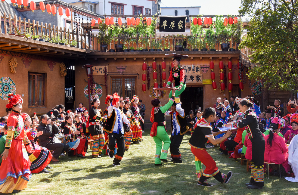 17:00晚餐享用【彝乡跳菜】,品彝族最丰盛的宴席,领略彝人最霸道酒歌,歌声不断酒不断。贵宾下车后,由彝族长老毕摩接车启福,保佑平安幸福,跨过彝族的大火盆,去灾祸。彝族最古老,最欢快的上菜开始表演,菜上齐后,献上彝族最具代表的敬酒歌,一首迎客调,欢迎远方的阿表哥阿表姐,远道而来一路辛苦了。领略完彝族三敬酒,酒足饭饱之余,欢快的篝火熊熊然烧,烧出彝族人火一样的热情,也祝福暗示着远方的贵宾,生活有火一样的激情,日子过的红红火火。