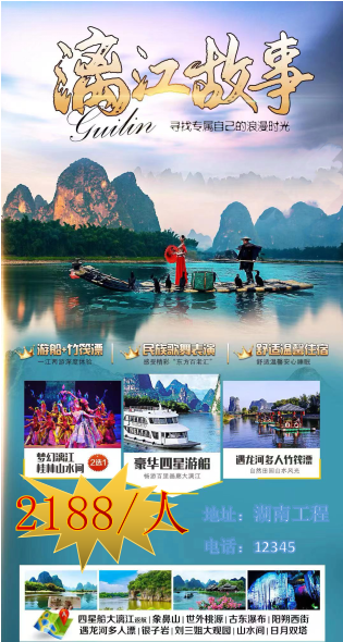 门票 | 世外桃源+古龙瀑布+银子岩150/人 遇龙河漂流134/人 四星级豪华邮轮310/人 刘三姐大观园118/人 梦幻漓江98/人