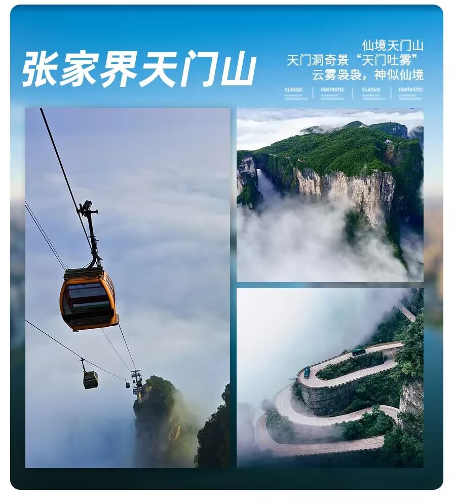 早餐后乘车赴【天门山国家森林公园】,乘世界最长高山客运索道(长7.5公里),走玻璃栈道,远观鬼谷洞;拜求儿洞;游天界佛国天门山寺;乘观光汽车体验天下第一公路奇观“99弯通天大道”的奇绝;登999级天梯或乘扶梯至世界最高天然穿山溶洞“天门洞”体验自然造化的神奇和震撼。下午乘车返回长沙,行程结束。