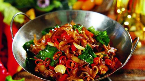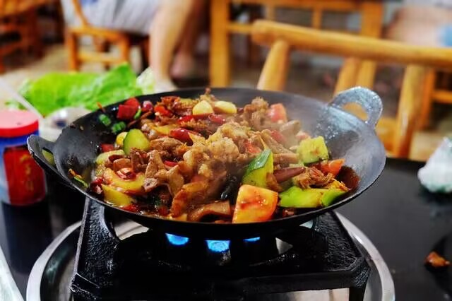 中餐升级为特色风味餐“三下锅”,张家界头牌菜,2009年荣登湖南14市州故乡菜之首。传明代嘉靖年间,朝廷征调湘鄂西土司兵上前线抗倭,恰好赶上年关,为不误军机,土司王下令提前—天过年,于是腊肉、豆腐、萝卜一锅煮,叫吃“合菜”,逐演变成“三下锅”。