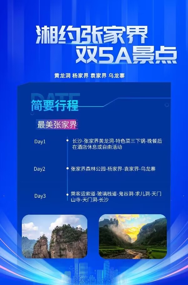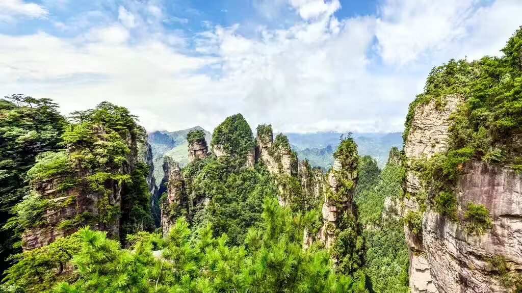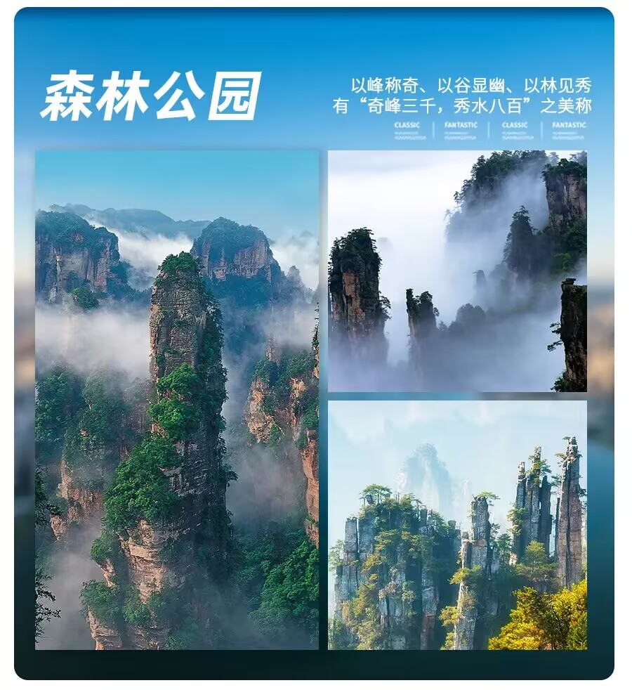 早餐后赴世界自然遗产武陵源风景区。乘百龙电梯上行VIP通道(72元/人,赠送),游览袁家界,观电影【阿凡达】中的“哈利路亚悬浮山”,迷魂台、天下第一桥等景点;中餐后乘景区环保车赴【杨家界景区】游览天然长城绝美峰墙、乌龙寨,乌龙寨原名叫“黑龙寨”,以前是土匪居住的地方,地处偏远、关隘险绝,四面悬崖,仅有一道上下,地势险要,所谓一夫当关,万夫莫开。之后乘坐百龙天梯下行VIP通道(72元/人,自理),游览十里画廊景区(游览时间不少于30分钟):采药老人、三姊妹峰、寿星迎宾等,后入住酒店。