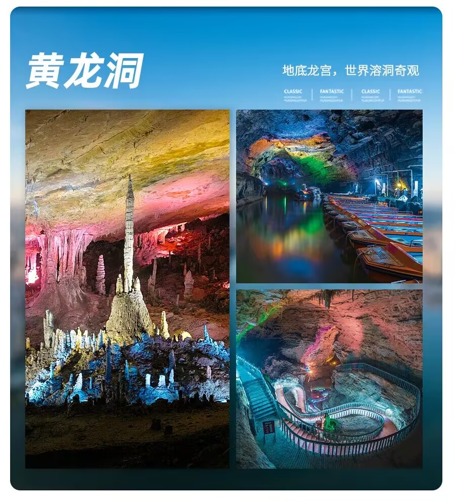 早7:00于长沙火车站阿波罗商业广场肯德基前坪集合,乘车赴张家界(约320公里,正常行车时间4小时30分钟,全程高速),中餐后游览【黄龙洞景区】,洞中有洞,洞中有河,无奇不有,名副其实的“地下魔宫”,如有兴趣可自费游览宝峰湖景区(148元/人起,门票96元+环保车25元/人+车费20元/人+导游服务费7元=148元,游览时间不少于1.5小时):世界自然遗产、被称为“世界湖泊经典”,集山水于一体、融民俗风情于一身,尤以奇秀的高峡平湖绝景“飞流直下三千尺”的宝峰飞瀑而闻名。