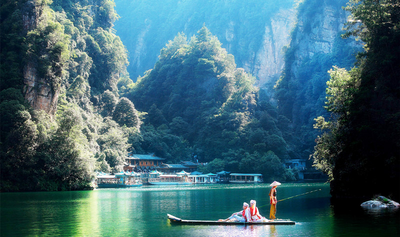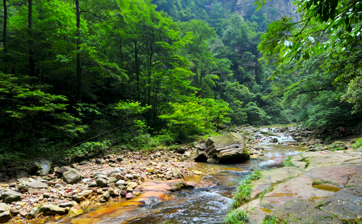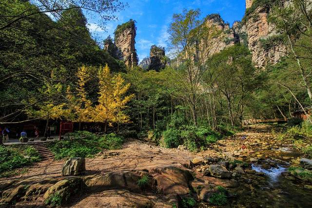 游览【张家界国家森林公园】-因溪水流经金鞭岩而得名的【金鞭溪】:张家界的黄金旅游区,水绕四门,蜿转曲折,幽静异常,随山而移,穿行在峰峦幽谷云间,迤逦延伸于鸟语花香之中(游览时间不少于2小时),车返市区,下午乘车返回张家界市区后自由活动(正常行车时间1小时,全程县道)。