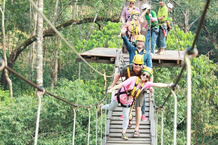 飞越丛林 通过树木将各种各样的障碍环节将连成一条线路,需要通过悬空桥梁、网道、步道、木桶、泰山秋千、飞狐索道和其他趣味环节等方式进行树木间的探险。通过爬、滑、游、跨、跳、飞等动作越过所有障碍,到达终点。在整个运动中,汇集了高空、速度、力量、毅力等户外探险所必备的元素,为参与者提供了感官上的刺激。