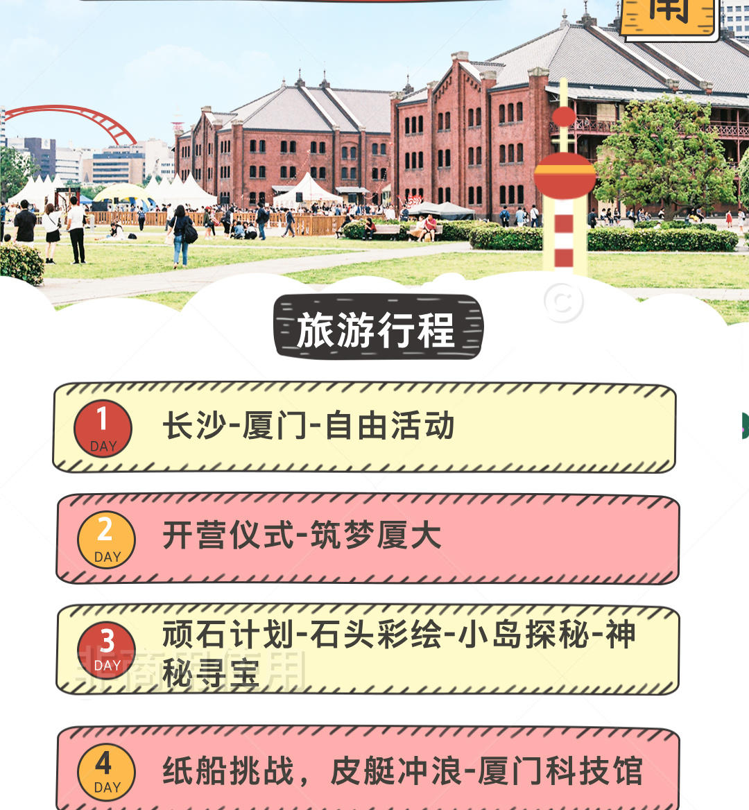上午:【纸船挑战 皮艇冲浪】。早餐后,乘车前往指定海滩,导游介绍船只的历史,以及福建造船工业的现状,后由协助老师按照具体人数进行分组,然后按照分组情况发放所需工具以及操作手册,划定各小组指定区域,在团队的合作下,共同建造各小组的纸船,并为小组的纸船命名。在导游的安排下,各小组纸船同时下水接受考验。坚持时间最长的船只即为挑战成功。纸船活动结束后导游自行安排皮划艇项目。