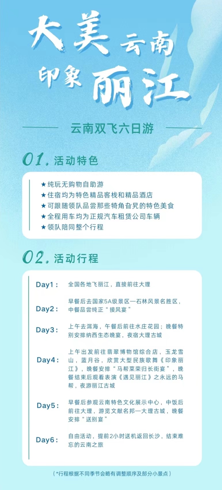 1、交通:长沙—昆明往返经济舱,含机场建设及燃油费;当地空调旅游大巴