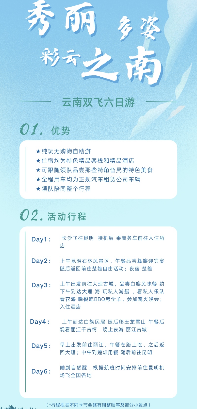 1、交通:长沙—昆明往返经济舱,含机场建设及燃油费;当地空调旅游大巴