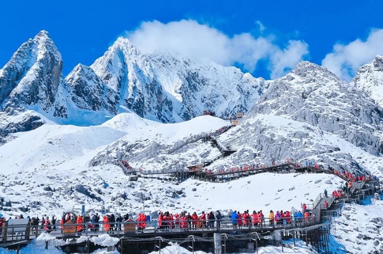 乘海拔4506米的【冰川大索道】游玉龙雪山,从海拔3000米的草甸出发,穿越高大的松杉树林,远眺纳西圣山,欣赏雄奇壮丽的玉龙雪山。