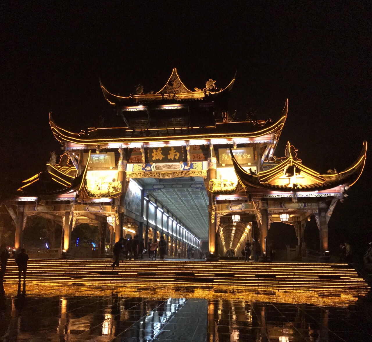 原名为“普济桥”,桥长约133米,4排5孔,曾多次损毁,南桥的最后一次改修,仍为5孔,桥长45米,宽10米,各种彩绘、雕梁画栋、民间彩塑、书画楹联溶为一体,被誉为“水上画楼”、“雄居江源第一桥”、“览胜台”。