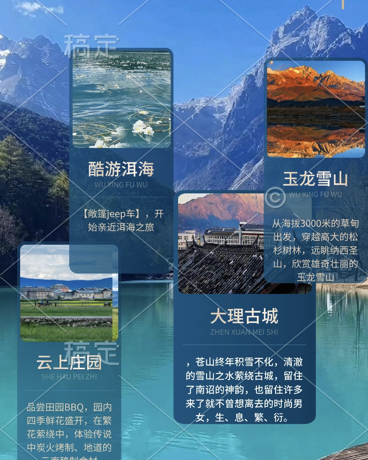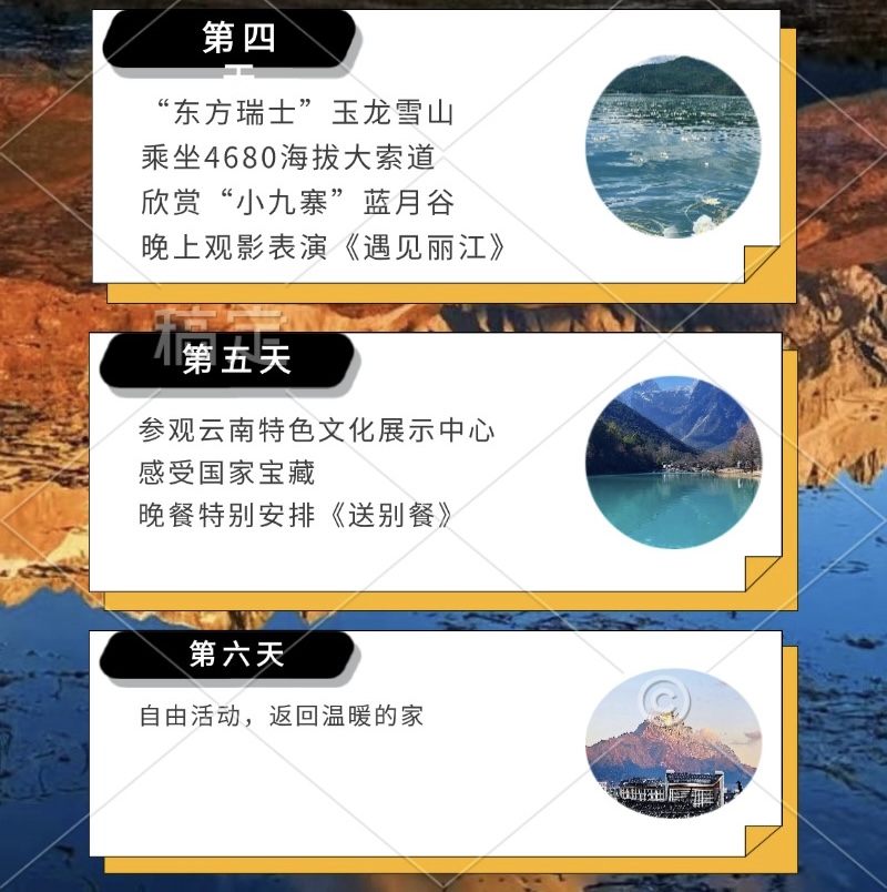 早餐后,乘车前往【翡翠博物馆综合店】俗话说“不赏翡翠枉来云南”,云南宝玉石资源储量大、品种丰富,是业内人士公认的“翡翠之乡”。之后前往玉龙雪山景区,抵达景区游览具有“东方瑞士“之称的【玉龙雪山风景区】,乘海拔4506米的【冰川大索道】游玉龙雪山,从海拔3000米的草甸出发,穿越高大的松杉树林,远眺纳西圣山,欣赏雄奇壮丽的玉龙雪山。游“小九寨”【蓝月谷】(温馨提示:游览约1小时,含电瓶),蓝月谷是条幽深的河谷。 冰雪从峰巅融化流淌而下,一落千丈,遇陡崖成瀑,过浅滩成溪,穿林过岩,清清澈澈地欢跳在人们面前)。回到玉龙雪山海拔3100米处,国际大导张艺谋导力作即将启幕,以雪山主峰为幕景的实景大型民族歌舞《印象丽江》雪山篇将在天地之间体验纯原生态演出(观赏时间60分钟)。