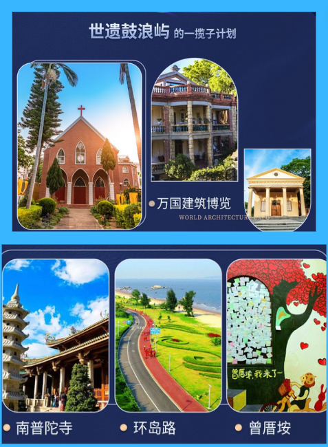 1 | 厦门 | 海天堂构88元/人 世界名人蜡像馆/红地毯蜡像馆60元/人 百年鼓浪屿70元/人 珍奇世界70元/人 友铭堂88元/人 海底世界90元/人 | 组合套餐298/人 | 120分钟 | 自愿自费 |