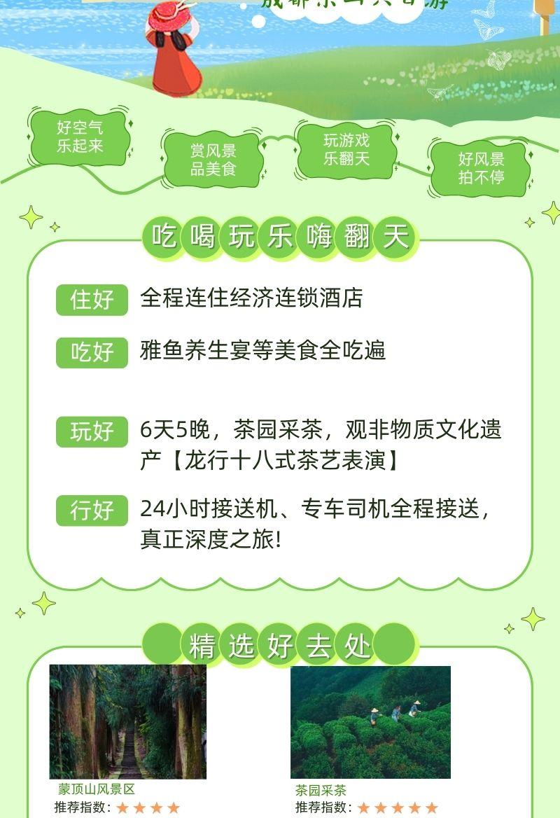 国家4A级旅游景区,省级自然与文化遗产;蒙顶山-世界茶文化发源地,世界茶文明的发祥地,茶马古道的起点,生态环境得天独厚普的蒙顶山被誉为“仙茶故乡”。【茶园采茶体验】:在工作人员的带领下,拎上竹篮,到茶园里体验采茶活动,当一回采茶仙子,观炒茶师傅手工制作茶叶,也可自己体验制茶的乐趣。乘索道(自费往返30元/人)至天盖寺,游览天盖寺、千年银杏群、茶神殿、茶文化碑廊、千年茶树王、阴阳麒麟石、甘露泉、皇茶园,而后沿山游道返回天盖寺品贡茶、观非物质文化遗产【龙行十八式茶艺表演】。(体验和观功夫茶艺表演时间40分钟、体验加游览约3小时)