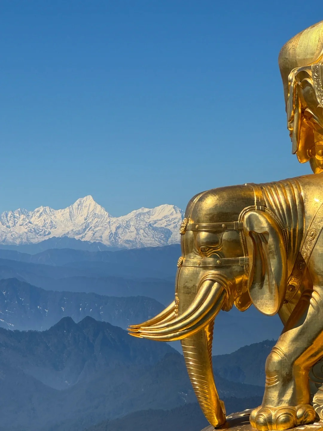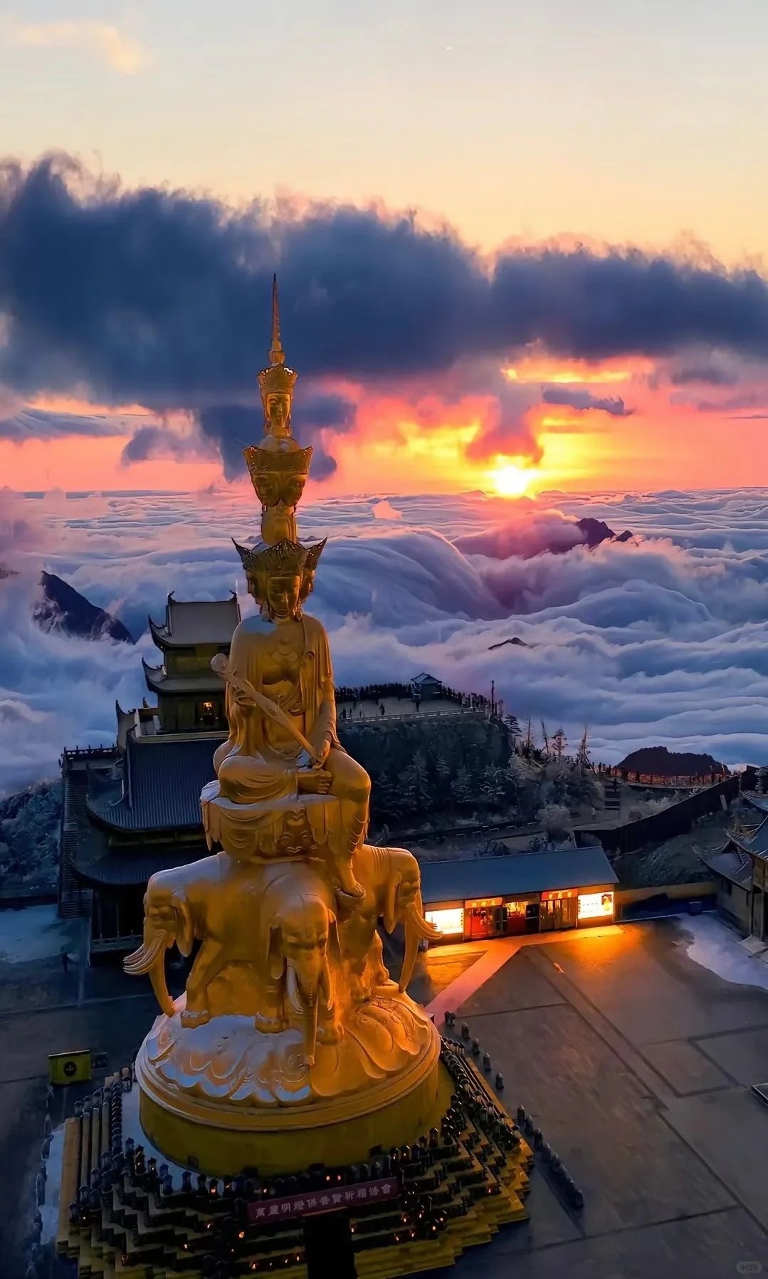 峨眉金顶是以一尊48米高的十方普贤铜像为中心,由耀日的金殿、雄浑的铜殿、灼灼的银殿和洁白的朝圣大道组成的新金顶。金顶为峨眉山游程的最高峰,其海拔为3077米。在峨眉山金顶,还可能欣赏峨眉的四大奇景:日出、云海、佛光、圣灯。