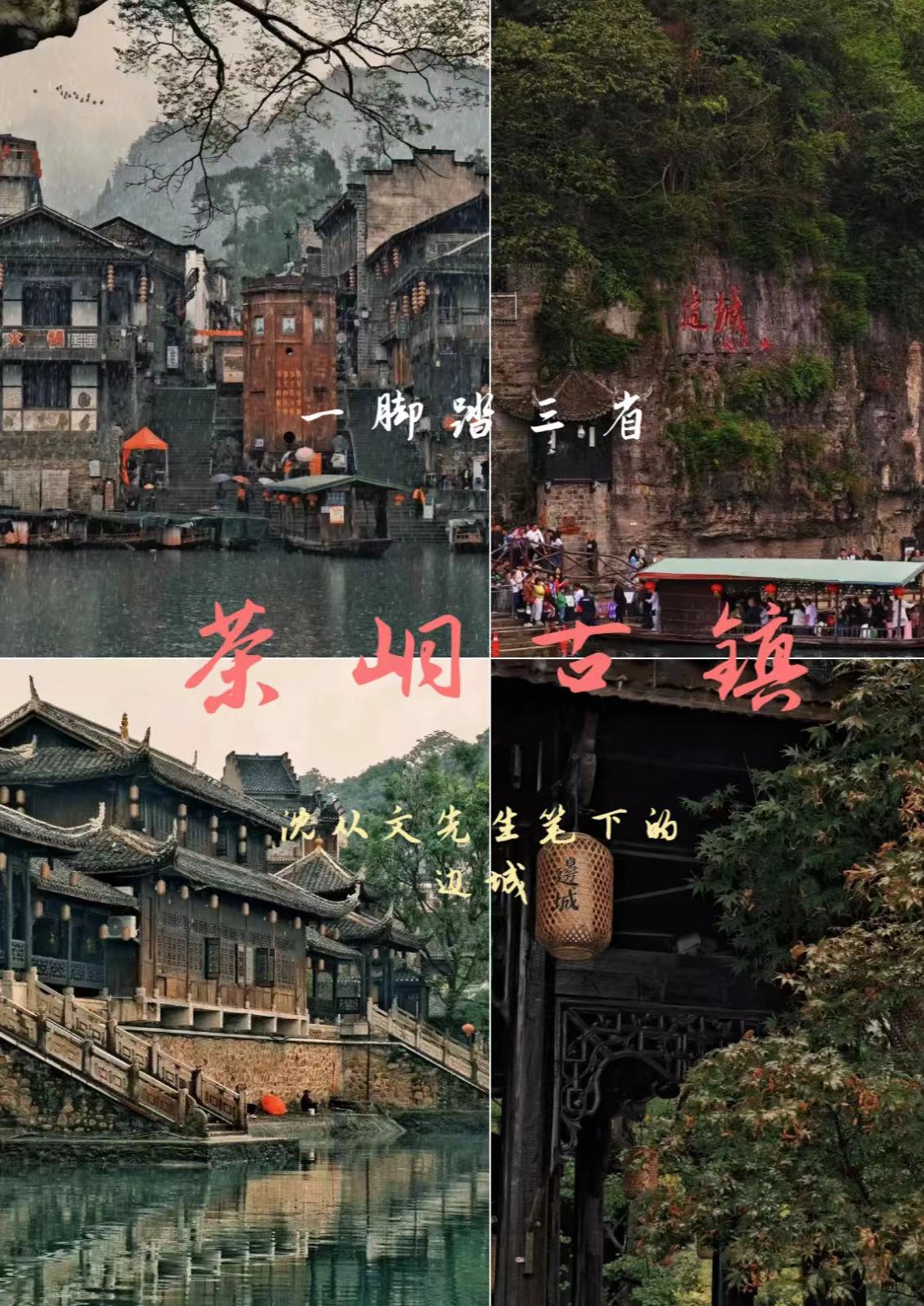 (门票已含),这里是湘黔渝三省市交界之地,是一脚踏三省的插花地,边城古建筑群立,其工艺、造型独特,土家苗寨风情别具一格。可参观百家书法园,名联坊,乘船上翠翠岛游览等。