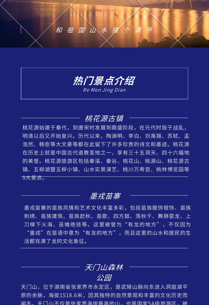早餐后前往宋祖英的家乡、大湘西地区最大、最美丽、民俗风情最浓郁的国家AAA景区,被誉为“千里苗疆第一寨”——【墨戎苗寨】(门票已赠送)。对了歌、喝了酒、击完鼓,才能走进这个原始神秘的古苗寨,“竿子营”营房、烽火台流淌着历史的沧桑、苗族人的家国情怀、民族大义;去茶农家里品鉴最好的“有机茶”——“古丈毛尖”;打上了08奥运开幕式的墨戎“四方鼓舞”,会让您感受到战神蚩尤出征的震撼,秋实丰收的喜悦;精彩绝伦的各种苗族手工纺织、锻制技艺让人叹为观止;神秘的湘西巫术更会让您瞠目结舌、目瞪口呆……跳完竹竿摆手舞,就可以去体验苗家寨子里待客的最高礼遇——“长龙宴”了,那些热情的姑娘,一定要您对上苗家山歌之后,才会奉上筷子,和苗家阿妹一起载歌载舞,真正感受到苗族的人的真、善、美。