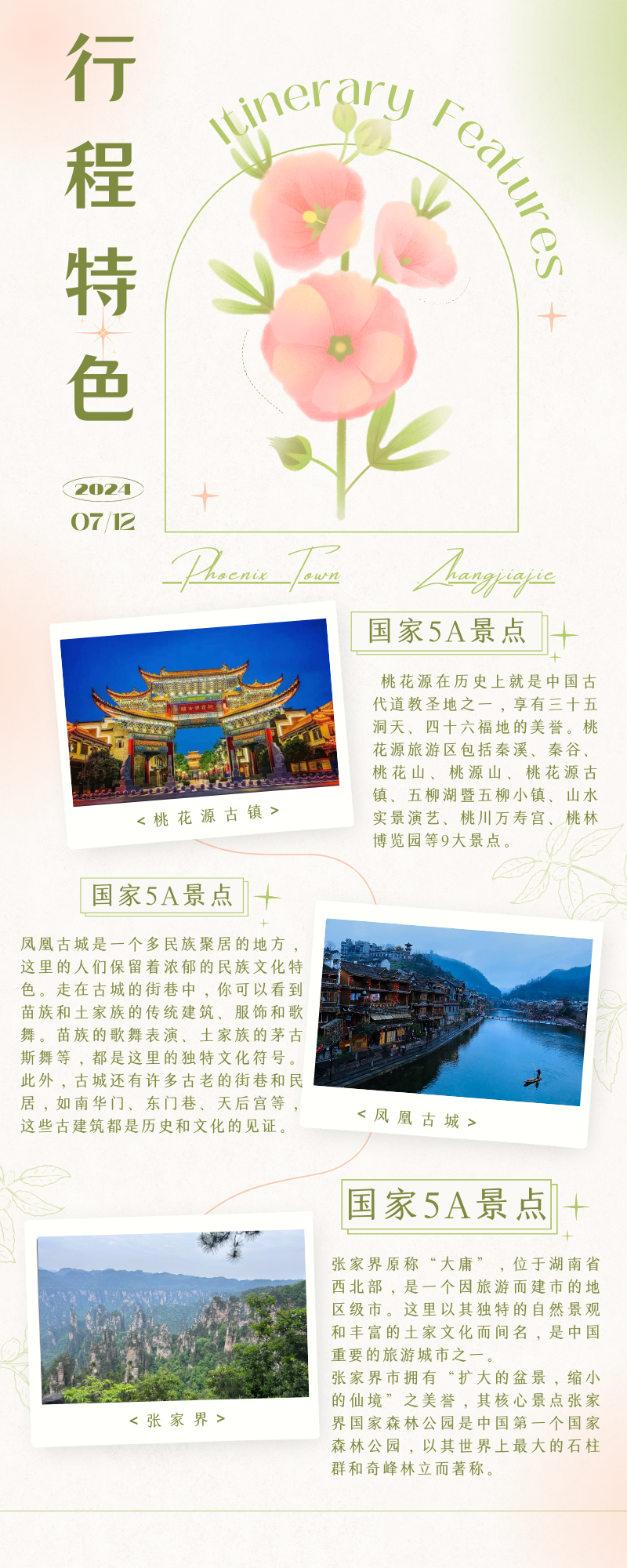 早上成都双流机场统一集合,乘机赴常德,后游览【桃花源古镇】主体景区包括桃花山、桃源山、秦人村、桃仙岭和灵境湖五个景区。后车赴中国最美丽的小城--【凤凰古城】(车程约4小时晚上自由逛古城。走走沱江的“跳岩”、明清风格的小石板街,再随着飘来姜糖的方向漫步于民俗一条街,你会发现街边小店里土家银饰,西兰卡普,竹器等工艺品琳琅满目,尝尝当地的特色小吃,会令你食欲顿生,一尝难忘,让您感受真正悠闲的凤凰古城之行(无导游陪同讲解,自由逛,如如遇景区检查,现补50元小门票,非推荐项目)。