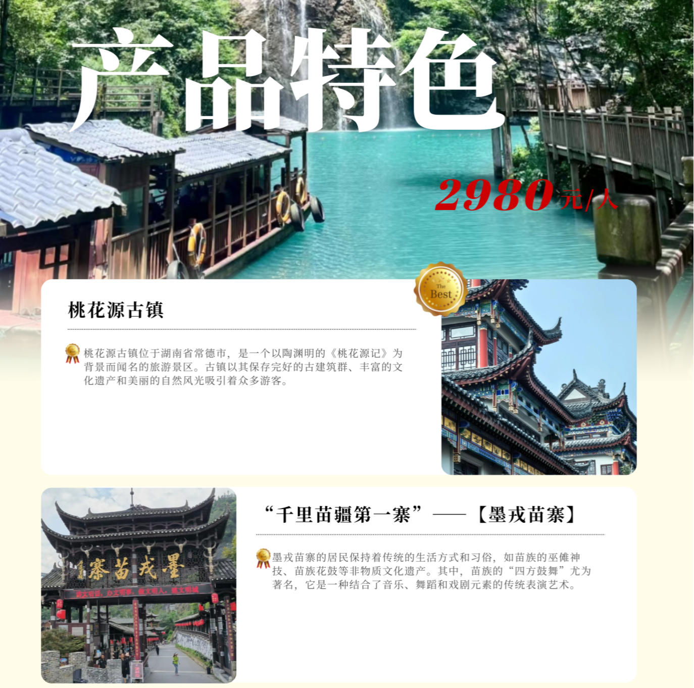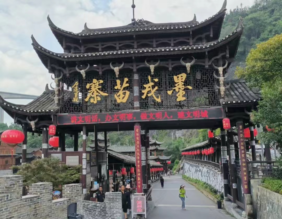 早餐后前往宋祖英的家乡、大湘西地区最大、最美丽、民俗风情最浓郁的国家AAA景区,被誉为“千里苗疆第一寨”——【墨戎苗寨】(门票已赠送)。对了歌、喝了酒、击完鼓,才能走进这个原始神秘的古苗寨,“竿子营”营房、烽火台流淌着历史的沧桑、苗族人的家国情怀、民族大义;去茶农家里品鉴最好的“有机茶”——“古丈毛尖”;打上了08奥运开幕式的墨戎“四方鼓舞”,会让您感受到战神蚩尤出征的震撼,秋实丰收的喜悦;精彩绝伦的各种苗族手工纺织、锻制技艺让人叹为观止;神秘的湘西巫术更会让您瞠目结舌、目瞪口呆……跳完竹竿摆手舞,就可以去体验苗家寨子里待客的最高礼遇——“长龙宴”了,那些热情的姑娘,一定要您对上苗家山歌之后,才会奉上筷子,和苗家阿妹一起载歌载舞,真正感受到苗族的人的真、善、美。