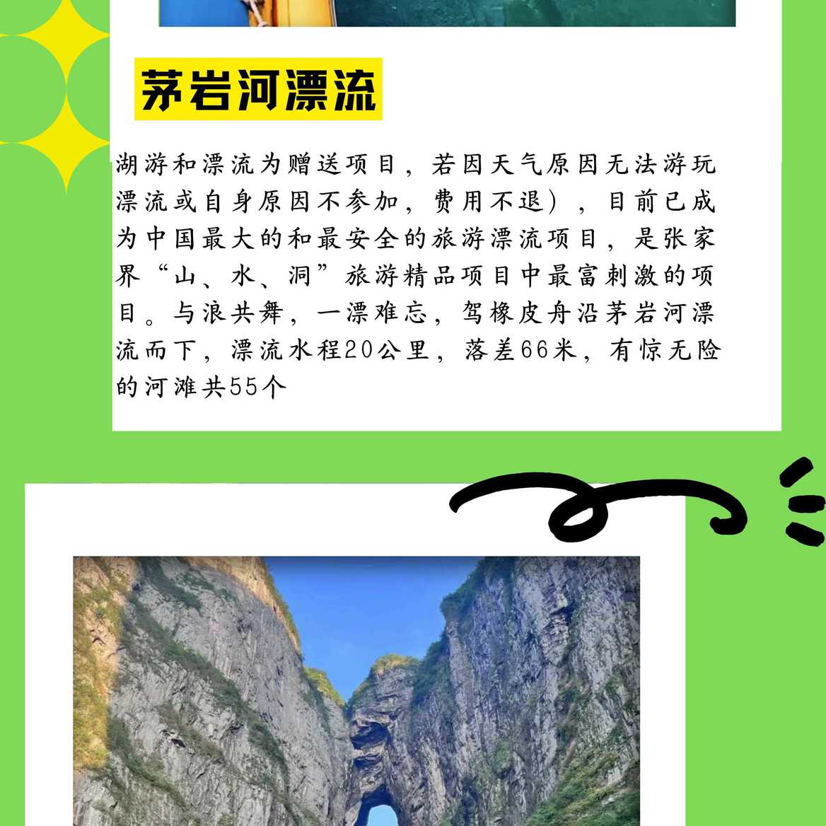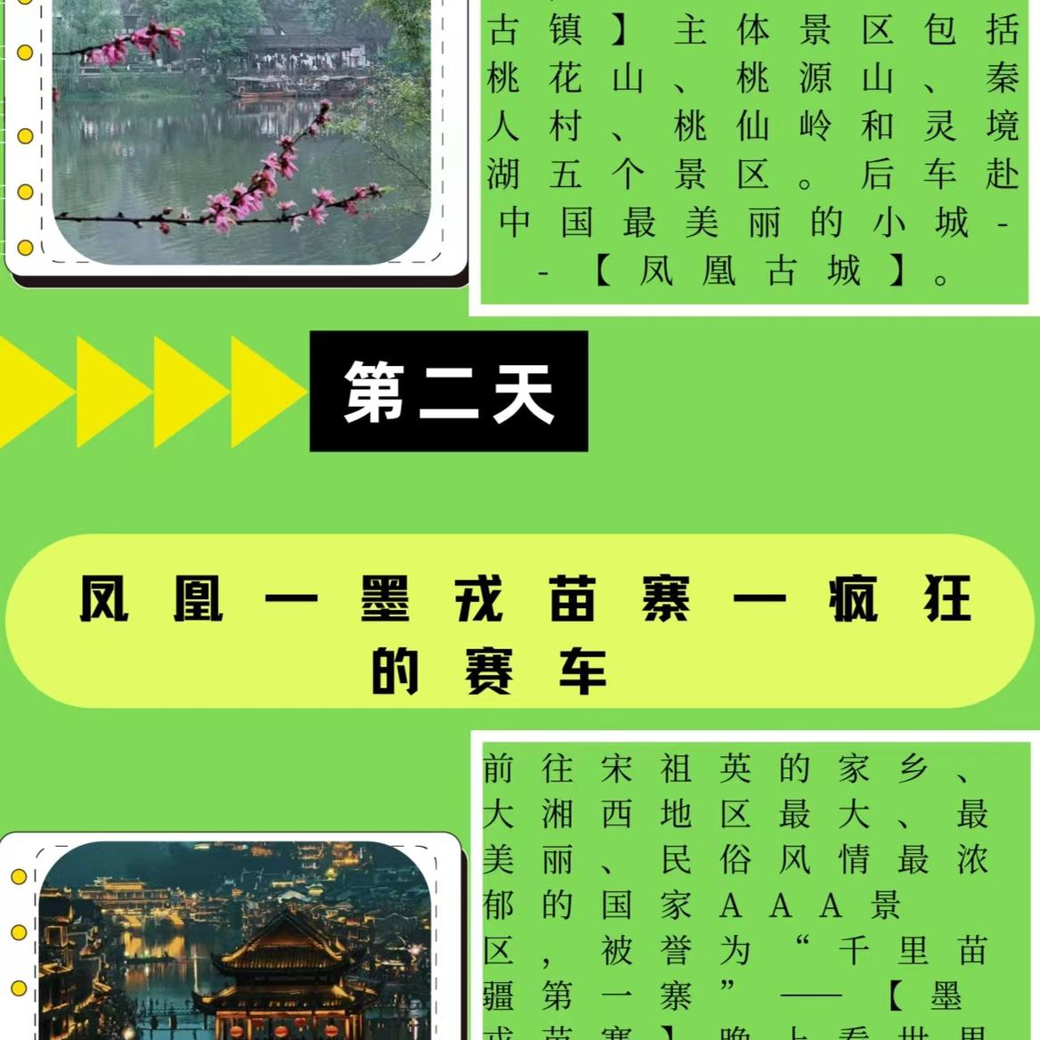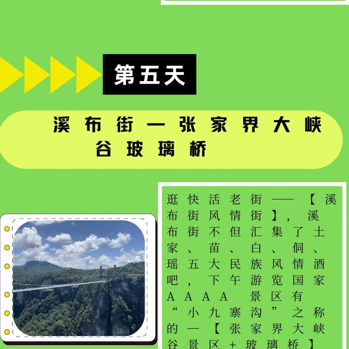 游览桃花源古镇和凤凰古城 参观墨戎苗寨 看世界奇观疯狂的赛车 九天玄女洞领略土家风情 游览茅岩河平湖游和茅岩河漂流,游玩张家界天门山国家森林公园和土司城 下午游览国家 AAAA 景区有“小九寨沟”之称的—张家界大峡谷景区+玻璃桥