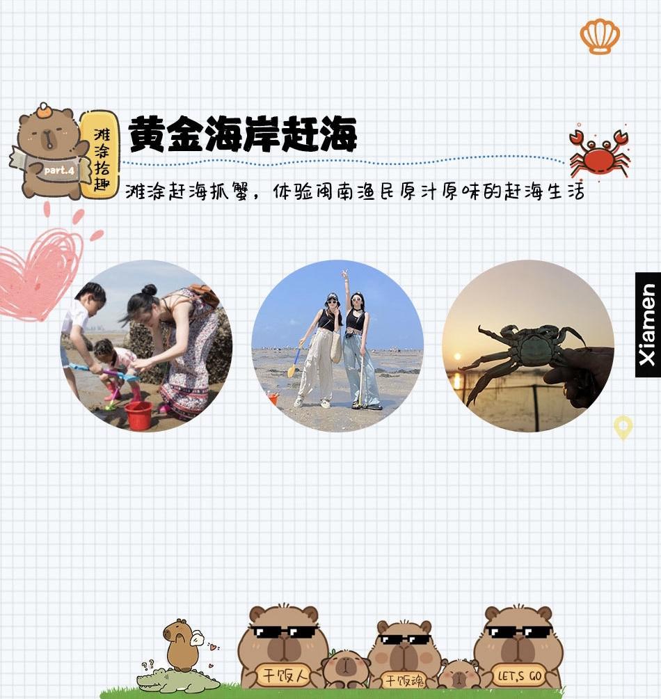 早上跟随教练出发厦门小渔村,漫无边际滩涂,弯弯如月的渔船。排排成立的生蚝海蛎田。渔民就靠此为生。换上渔靴,戴好帽子,背上渔篓,手戴手套,握着铲子冲向滩涂。聆听教练的科普,对面的金门列岛。肉眼直击,渔民海上放牧的野生花蛤。接着前往【围网捕鱼】(游览时间不少于30分钟)用渔民千百年的捕鱼方式体验一把。潮水退去,渔网里面就留有各种各样的海货。海蟹/海鱼/海怪/皮皮虾。都有机会映入眼帘,盯好海货,提前下手。提着收获前往餐厅免费加工享用午餐。之后前往码头随着潮水起落,抛下【地笼】,寄好绳,做好属于自己的标志。静候海蟹跟随秘制饵料。海蟹爬行进去,倒行无路,静候海货,(游览时间不少于30分钟)台湾珊瑚馆位于金门邮轮隔壁。是连接台湾和厦门的一个重要的标志性场馆。让我们一起了解海底珊瑚的形成,接着前往厦门帆船中心体验【帆船出海】/[+100元/人可享受私人游艇出海](乘坐时间不少于40分钟),杨帆起航,5-10人一艘。可缓可急,全由您自行和船长商量把握。收完笼子带着美好的心情回程。行程期间额外赠送【沙滩赶鸭】【沙滩高尔夫】【沙滩放风筝】另有精美奖品赠送。