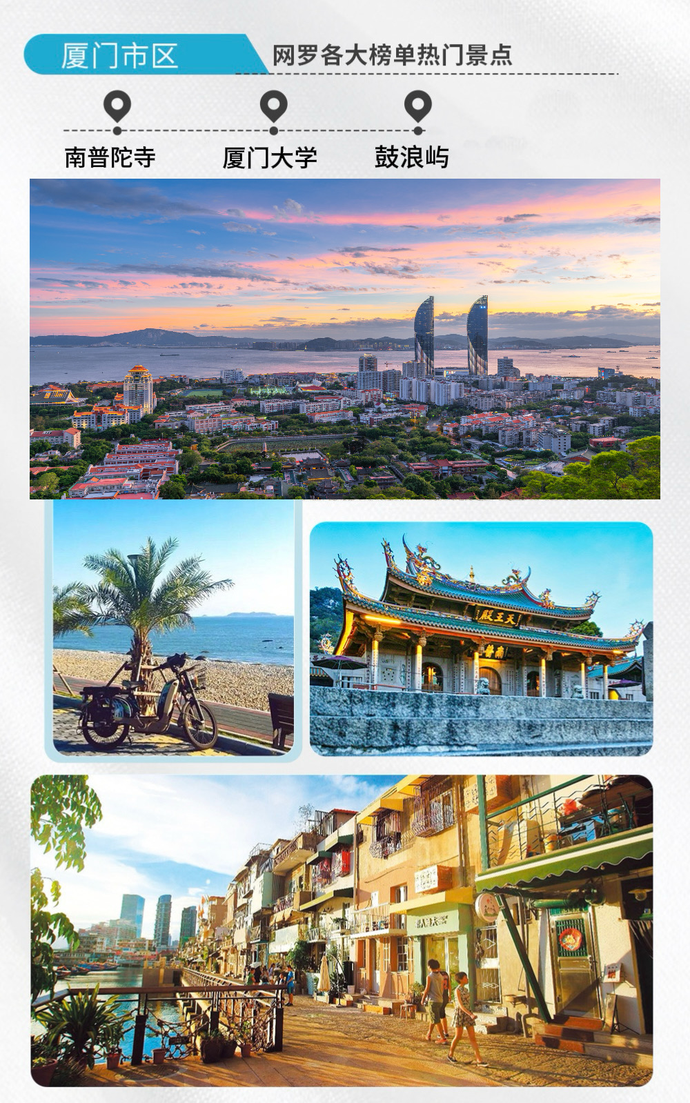 厦门作为一个热门的旅游目的地,其卖点主要包括丰富的文化旅游资源、独特的城市风貌、美食体验以及多样化的旅游线路。 丰富的文化旅游资源和独特的城市风貌: 厦门融合了多元的文化元素,如闽南文化、华侨文化等,形成了独特的城市风貌。 厦门拥有多条主题旅游线路,如金鸡唱响、聆听鹭岛乐赏好剧、街头音乐文艺满城等,这些线路涵盖了从自然风光到文化艺术的多个方面,为游客提供了丰富的选择1。 美食体验: 厦门的美食文化也是其重要的旅游卖点之一。土笋冻、沙茶面、鱼皮花生、同安封肉、姜母鸭