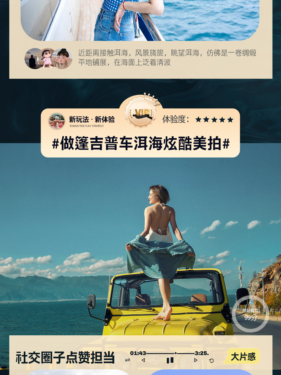 之后乘坐【敞篷车旅拍】一路欣赏无敌海景、田园风光、白族村落、海景湿地、路伴随蓝天白云、欣赏着蔚蓝的洱海和盛开的格桑花、沿途经过马久邑是一个最亲洱海的白族村落,您可以与爱人、家人、朋友,坐着吉普车,环游洱海,吹吹海风,在蓝天白云间放肆奔驰。(一车四人,配备驾驶员,若因天气因素影响,取消活动,旅客需知!!)