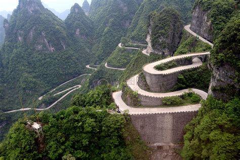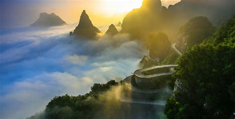 天门山山顶,观赏奇妙美丽的盆景花园,游览天门翻水、北俯视天门、登云梦仙顶、【玻璃栈道】、天门山寺、体验“云生脚下、奇峰尽览、万象目中”豪迈感觉。山顶游玩后座索道下山至中转站换乘环保车,感受“天下第一公路奇观”——【通天大道】的惊奇体验沿途观赏七级瀑布、金龟驮元宝、将军峰、箭杆峰等景观。抵达上天梯,攀登999级台阶的上天梯,抵达天门洞底,感受造化神奇,尽情欣赏天门洞内外的壮丽景色。