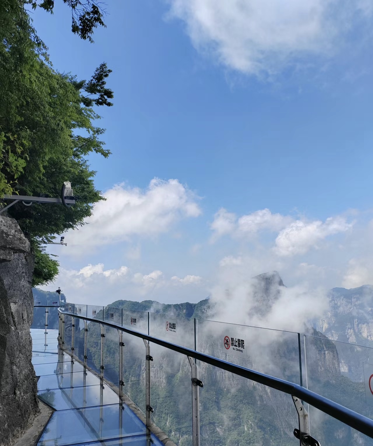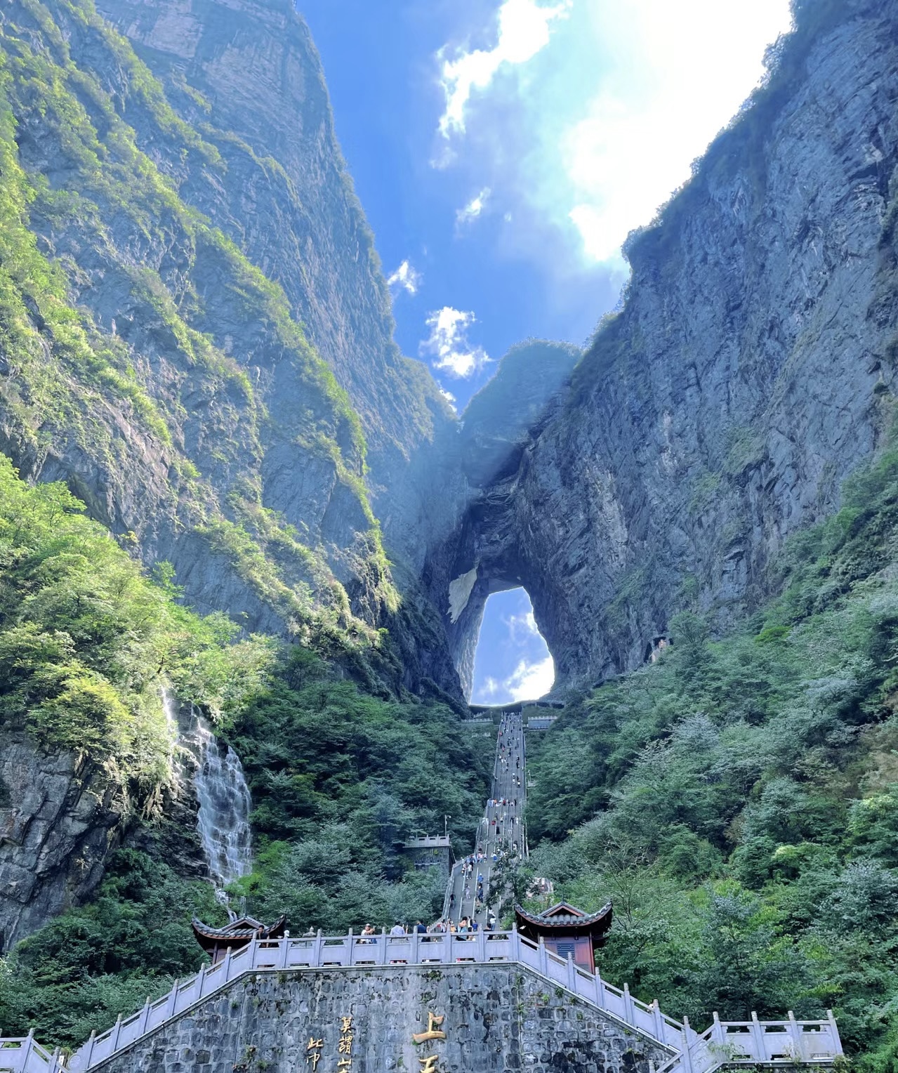 早餐后游览“人类第一次架机穿越自然山洞”、“中国最受外国人欢迎的五十个地方之一”“俄罗斯苏-30战斗机飞行表演地”——【天门山国家森林公园】,乘坐世界最长的高山客运索道——【天门山索道】,体验凌空飞仙般的神奇感觉,空中欣赏壮丽的山水画长卷,直达天门山山顶,观赏奇妙美丽的盆景花园,游览天门翻水、北俯视天门、登云梦仙顶、【玻璃栈道】、天门山寺、体验“云生脚下、奇峰尽览、万象目中”豪迈感觉。山顶游玩后座索道下山至中转站换乘环保车,感受“天下第一公路奇观”——【通天大道】的惊奇体验沿途观赏七级瀑布、金龟驮元宝、将军峰、箭杆峰等景观。抵达上天梯,攀登999级台阶的上天梯,抵达天门洞底,感受造化神奇,尽情欣赏天门洞内外的壮丽景色。