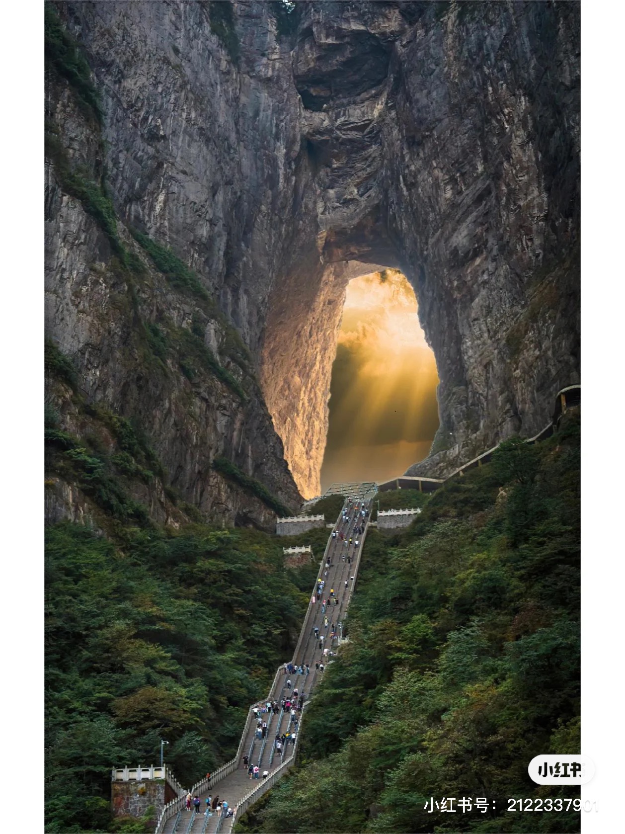 早餐后游览“人类第一次架机穿越自然山洞”、“中国最受外国人欢迎的五十个地方之一”“俄罗斯苏-30战斗机飞行表演地”——【天门山国家森林公园】,乘坐世界最长的高山客运索道——【天门山索道】,体验凌空飞仙般的神奇感觉,空中欣赏壮丽的山水画长卷,直达天门山山顶,观赏奇妙美丽的盆景花园,游览天门翻水、北俯视天门、登云梦仙顶、【玻璃栈道】、天门山寺、体验“云生脚下、奇峰尽览、万象目中”豪迈感觉。山顶游玩后座索道下山至中转站换乘环保车,感受“天下第一公路奇观”——【通天大道】的惊奇体验沿途观赏七级瀑布、金龟驮元宝、将军峰、箭杆峰等景观。抵达上天梯,攀登999级台阶的上天梯,抵达天门洞底,感受造化神奇,尽情欣赏天门洞内外的壮丽景色。